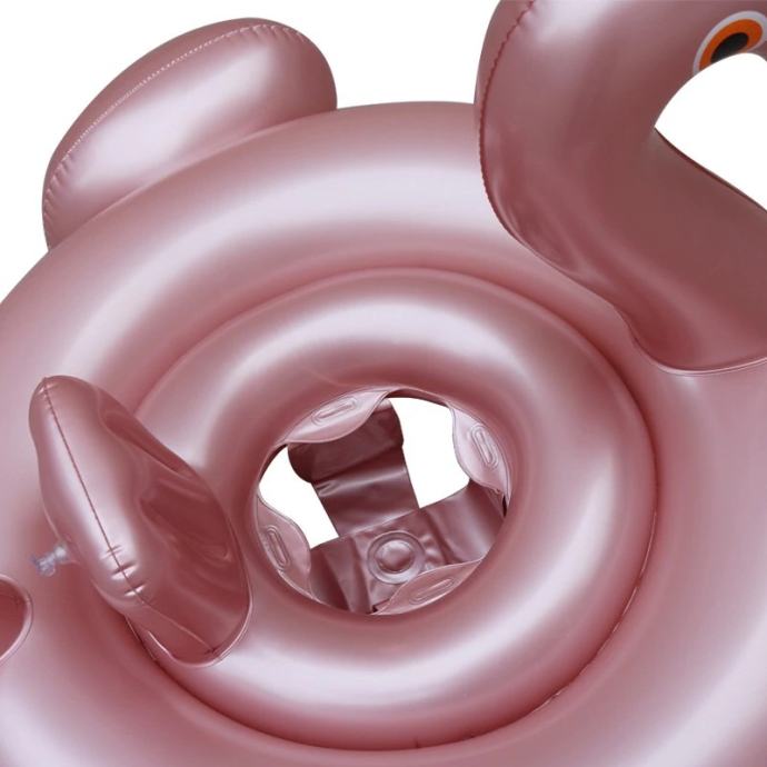 Ružičasti kotač na napuhavanje u obliku flaminga za djecu sa sjedalicom, izrađen od visokokvalitetne PVC plastike koja jamči trajnost.