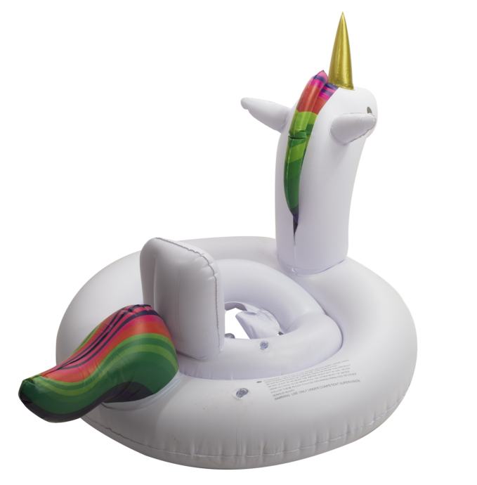 Kotač na napuhavanje sa sjedalom za djecu u obliku jednoroga, izrađen od visokokvalitetne PVC plastike koja jamči izdržljivost.