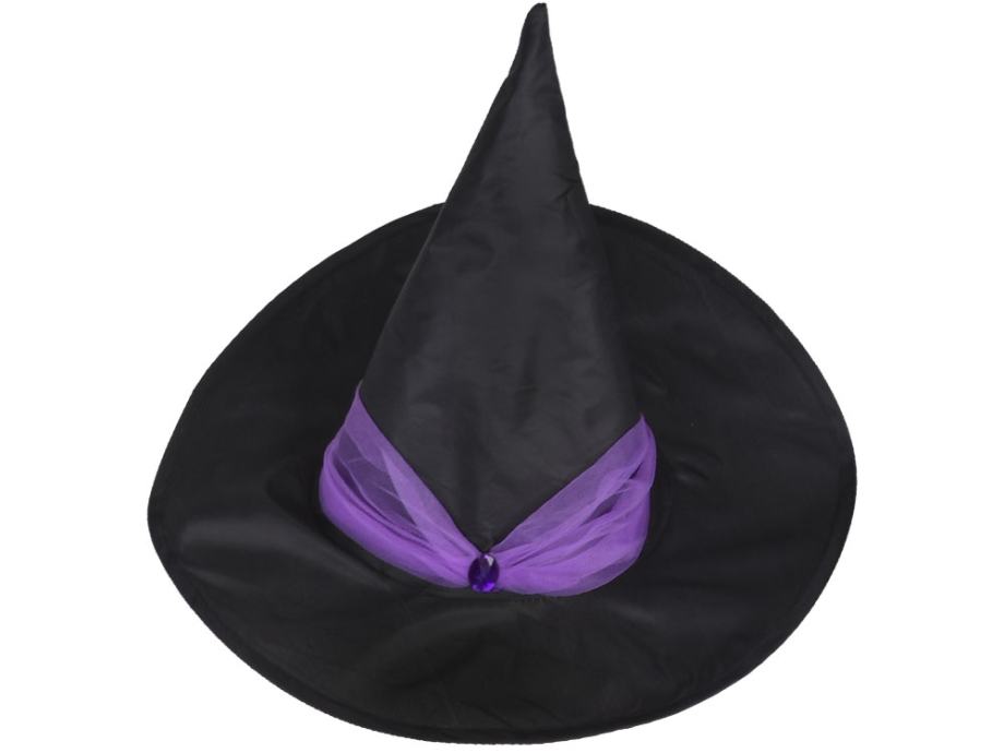 Crni šiljati šešir s ukrasnim ljubičastim tilom i dijamantom