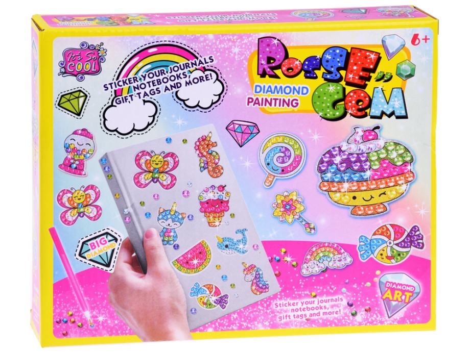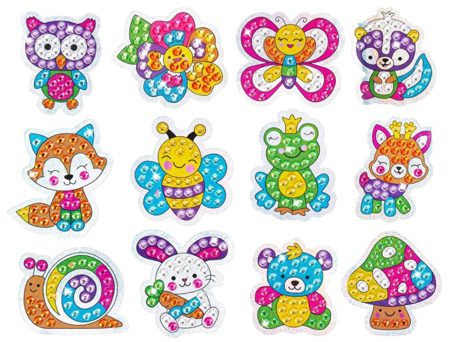 Set vam omogućuje izradu 12 prekrasnih naljepnica s nevjerojatno šarenim dijamantima. Igra uključuje odabir odgovarajućih boja dijamanata i njihovo prenošenje na predložak pomoću ljepila pomoću posebne olovke. Nakon slaganja elemenata dobivamo lijepu šarenu dekoraciju. Koristeći nevjerojatne, sjajne naljepnice koje izradite, možete ukrasiti svoju omiljenu bilježnicu, mapu, dnevnik ili foto album.
