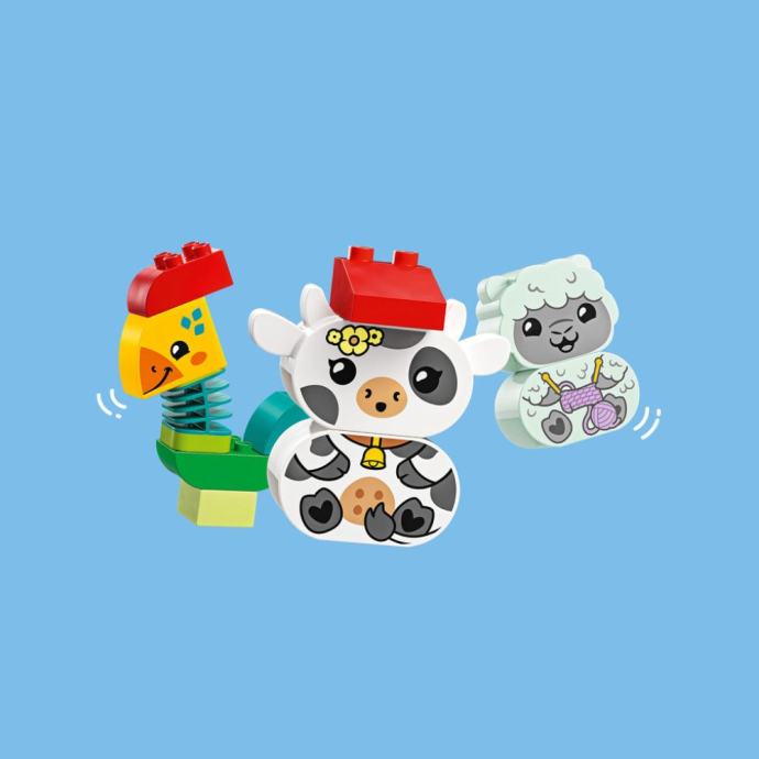 Komplet sadrži: Četiri slatke, složive životinje: pijetao, konj, janje i krava, tri spojiva vagona u različitim bojama i dvije dodatne kocke za dodatnu kreativnost.