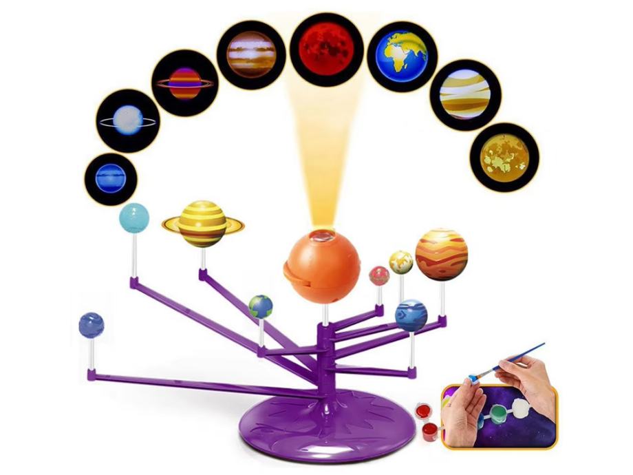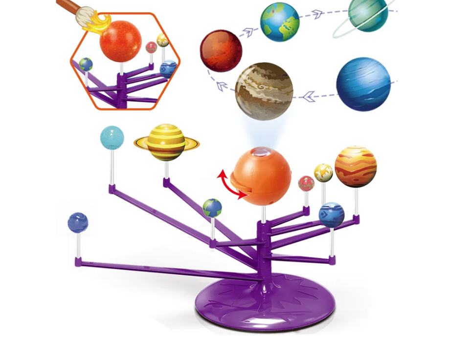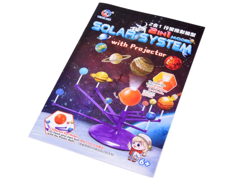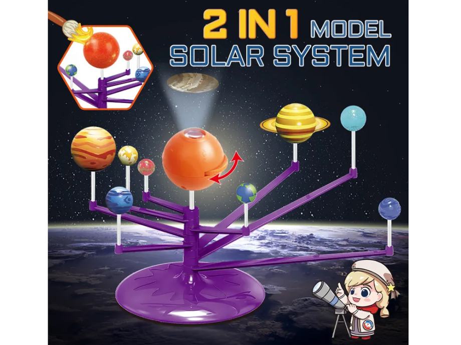 Mini solarni sustav 2u1 je interaktivna, kreativna i edukativna igračka koja djeci omogućuje da sama grade i slikaju planete. Ovaj set je idealan alat za učenje astronomije, a također razvija kreativnost kroz ručnu likovnu nastavu. Set također uključuje narančastu kuglu koja predstavlja Sunce, opremljenu baterijama i projektorom koji prikazuje planete na stropu.