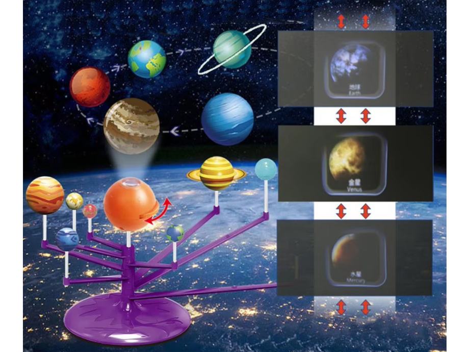 - Narančasto Sunce s baterijama - Centralni element seta je narančasta kugla koja simbolizira Sunce. Ima ugrađene baterije i projektor. Nakon pomicanja klizača, Sunce prikazuje slike planeta na stropu, stvarajući nevjerojatan vizualni efekt i obogaćujući iskustvo igranja.