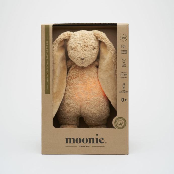 Simpatični dječji zečić s noćnim svjetlom i opuštajućim zvukovima pomaže djetetu da se smiri i lakše zaspi. Igračka nudi pet prirodnih opuštajućih zvukova, uspavanku sastavljenu posebno za novorođenčad te LED lampu koja se ne zagrijava i potpuno je sigurna za bebu. Zečić Moonie izrađeno je od najkvalitetnijih, certificiranih i sigurnih materijala za djecu. Svi materijali korišteni za izradu zečića Moonie imaju OKO-TEX certifikat te su izuzeto mekani i ugodni na dodir.