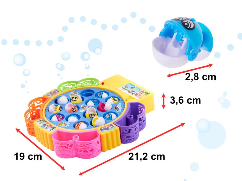 Kolo s ribama vrti se u ritmu vesele glazbe. Šarene posude za ulovljenu ribu se mogu ukloniti.