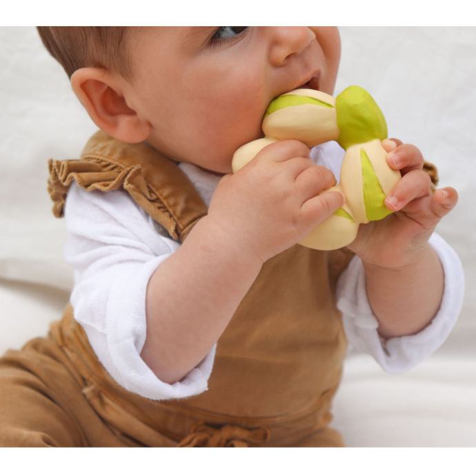 Pistacio Patricio je igračka za bebu u obliku pistacija, i to pogodna za žvakanje! Namijenjena je za osjetilnu igru, pružanje pomoći pri procesu rasta zubića, a služi i kao igračka pri kupanju. Malene desni obožavaju teksturu kaučuka, a realističan oblik stimulirat će bebina osjetila te pomoći pri umirivanju bolnih desni. Dizajnirana je s rupom u sredini kako biste je jednostavno mogli objesiti na kolica i ponijeti svugdje sa sobom – što ćete morati, jer će je beba obožavati!