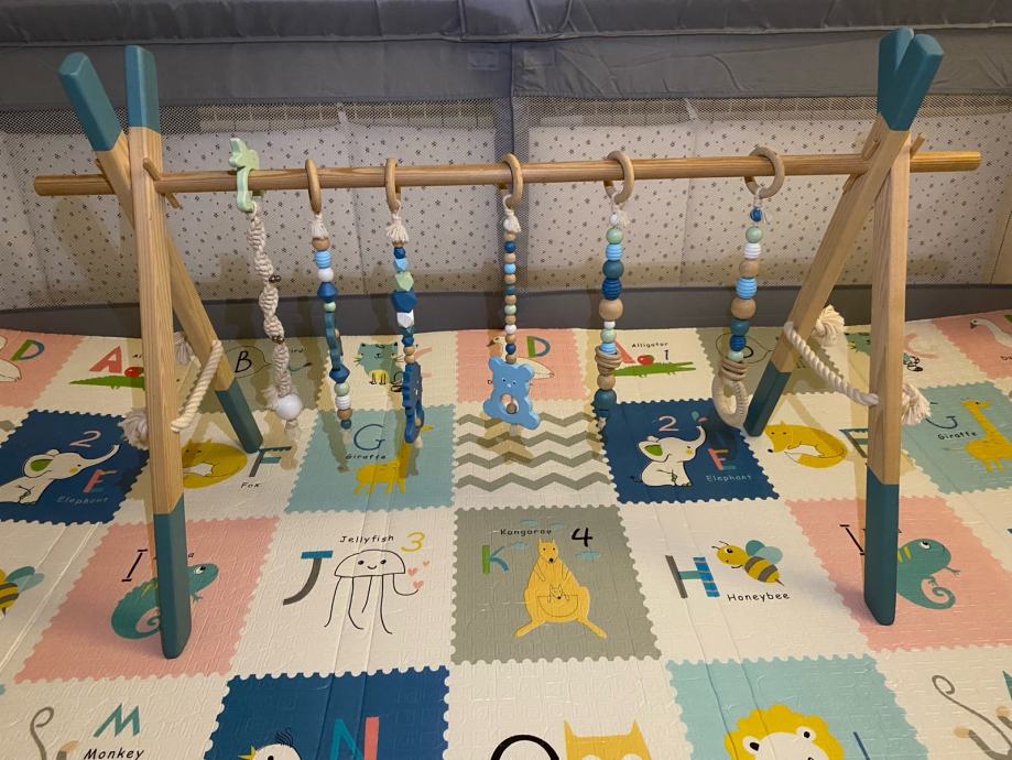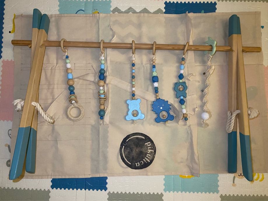 Ovaj baby gym se izrađuje isključivo od obrađenog drvenog materijala, u kombinaciji s drvenim perlama raznih dimenzija i oblika.