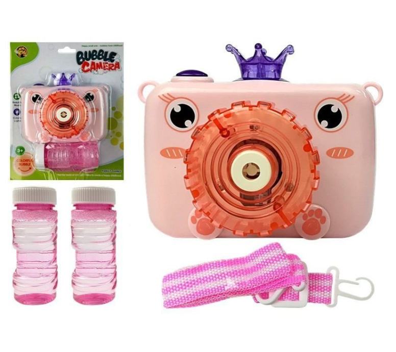 Prekrasna roza kamera koja stvara mjehuriće. Savršen poklon za igranje u toplim danima. Dodatna prednost kamere su svjetlosni i zvučni efekti. Samo ulijte tekućinu, pritisnite tipku i dijete će vidjeti puno mjehurića kako izlaze iz leće fotoaparata. Uključuje remen, tako da ga možete udobno nositi oko vrata poput prave kamere.
