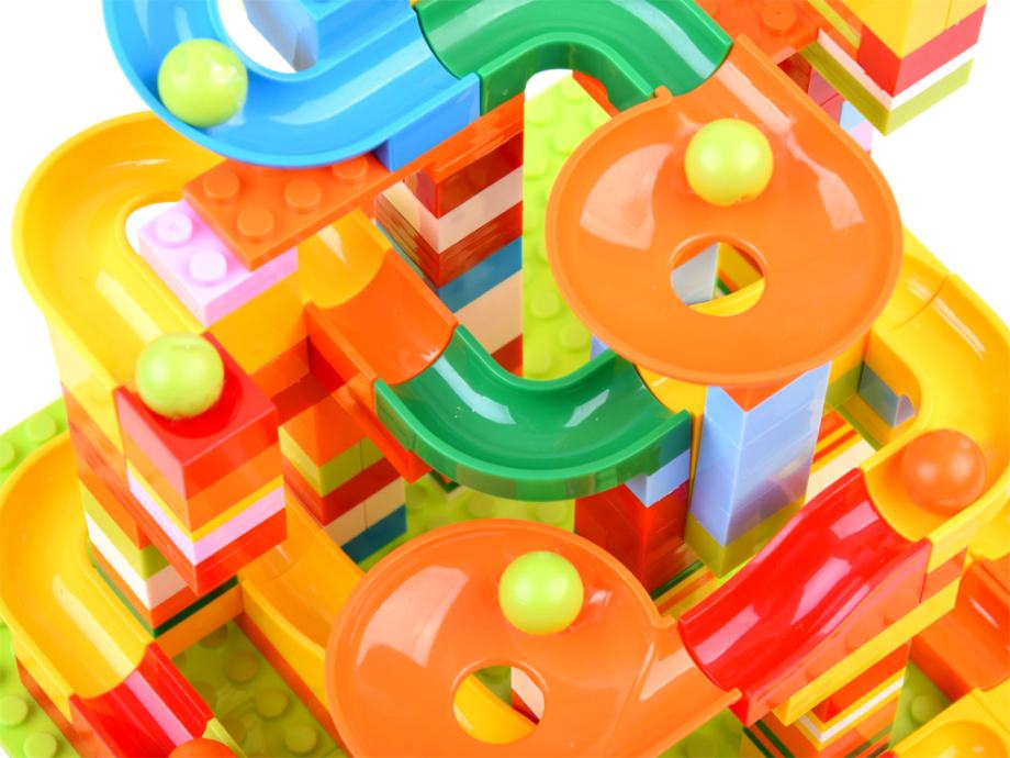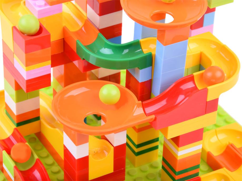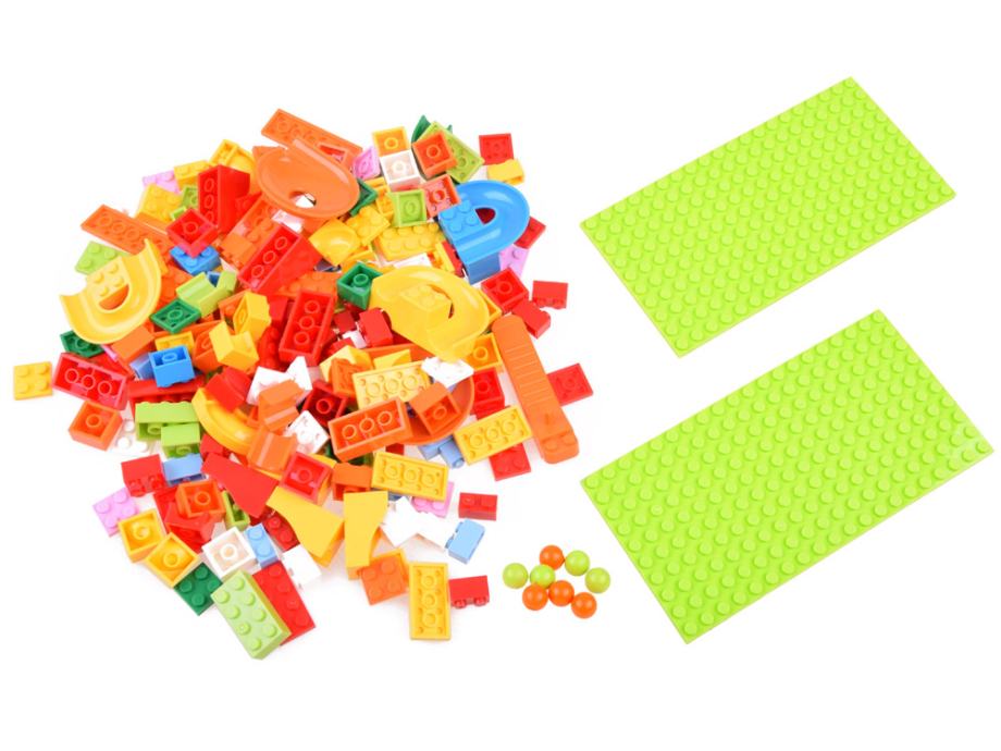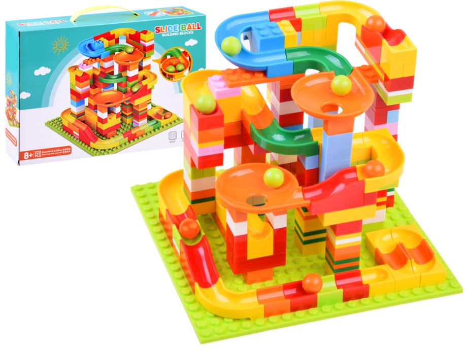 Šarene kocke za izgradnju staze za loptice svidjet će se svim ljubiteljima zagonetki i slaganja kocaka. Set uključuje čak 220 elemenata različitih boja i oblika.