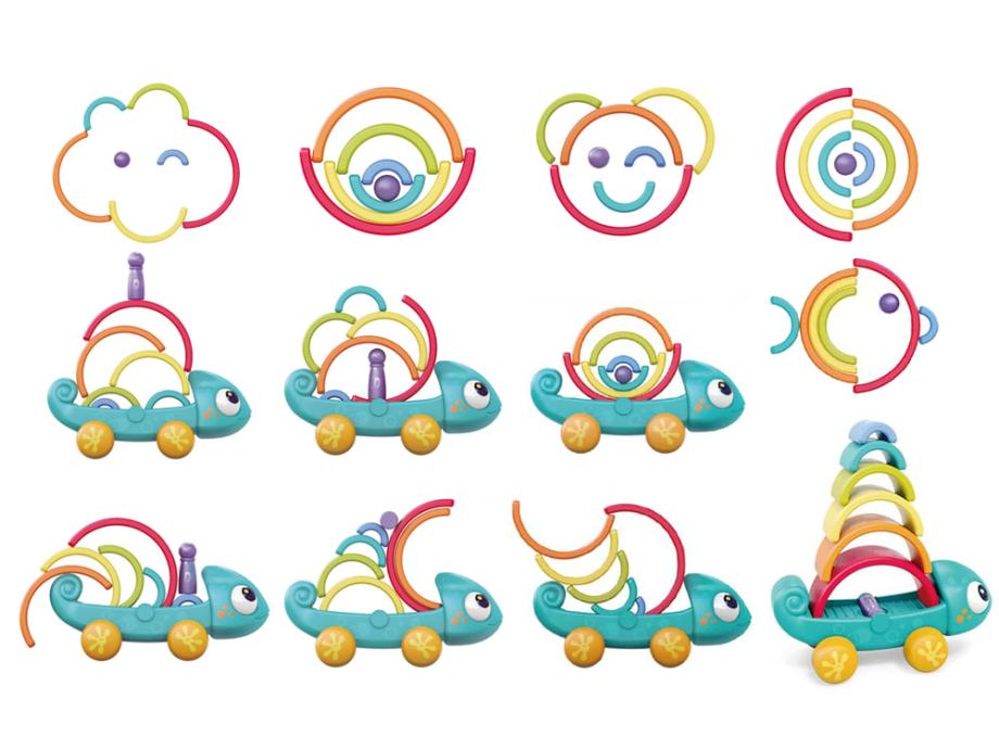 Na kameleonovim leđima mališan slaže razne konstrukcije, pritom vježbajući preciznost slaganja i koordinaciju oko-ruka. Tijekom igranja možete koristiti primjere konstrukcija iz knjižice koja se nalazi u kompletu.