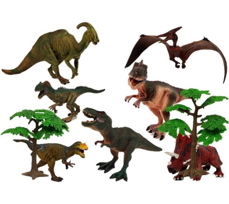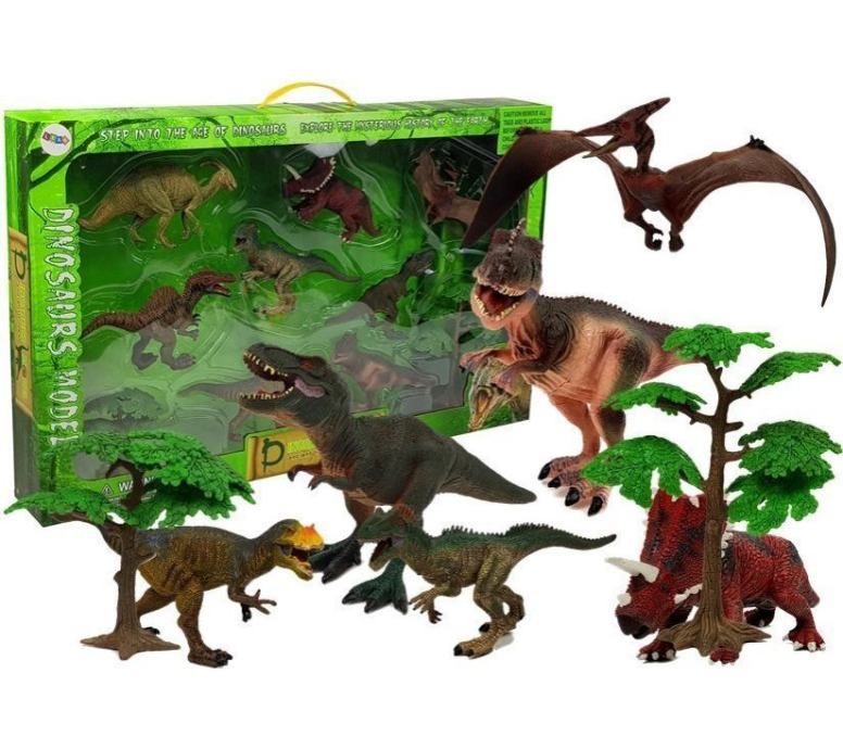 Cijeli set uključuje 8 figura dinosaura i dva stabla. Njihova raznolikost je impresivna.