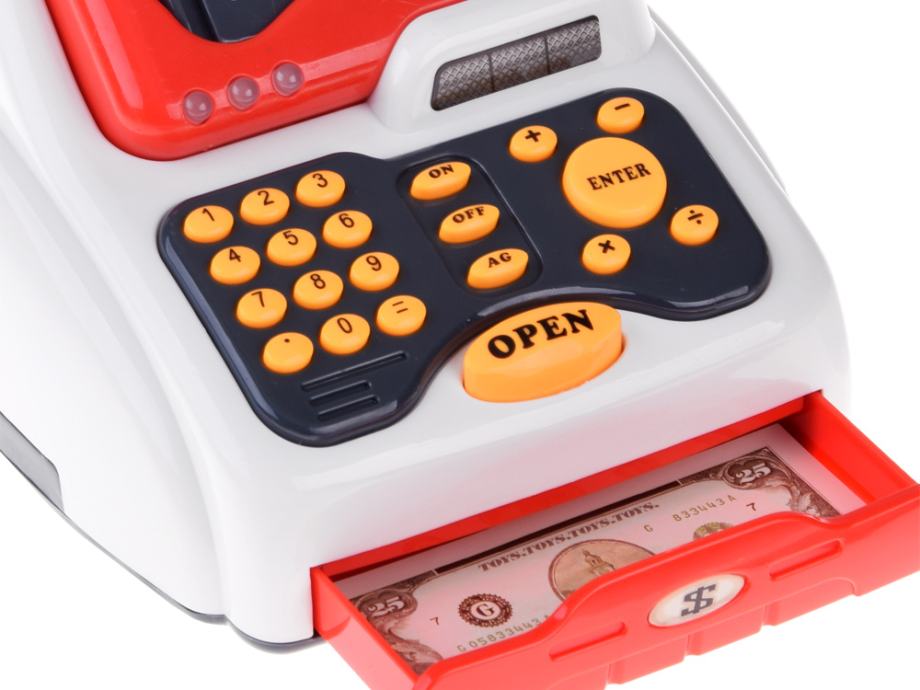 - blagajnom - proizvodi zvučni efekt pri pritisku na tipke i svijetle tri LED diode u boji, ladica se otvara tipkom za otvaranje