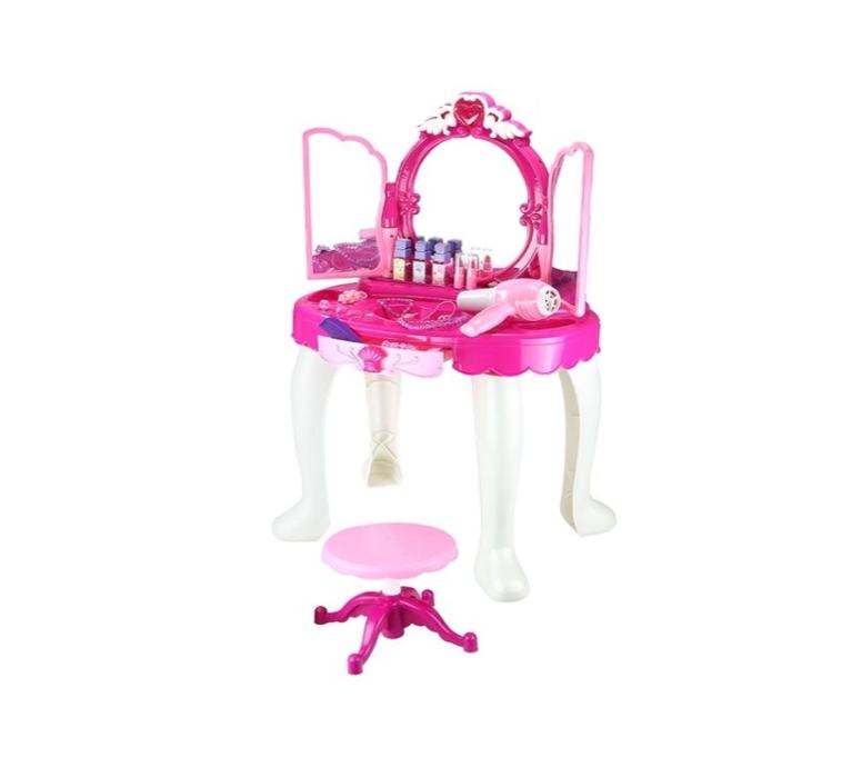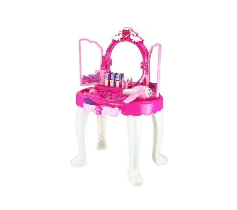 Radna površina ima ladicu na izvlačenje i posebne udubljenja na ploči stola za spremanje malih predmeta pričvršćenih na komplet. Sigurni smo da će se ovaj pribor svidjeti djevojci, proširujući tako mogućnosti igre. Veličina toaletnog stolića i stolica prilagođena je visini djevojčica, što igru čini vrlo ugodnom. Dizajn igračke podsjeća na element dekora koji se nalazi u svakoj spavaćoj sobi princeza iz bajke. Ružičaste, vrlo djevojačke boje omogućit će vam da igračku uskladite s dekorom gotovo svake dječje sobe.