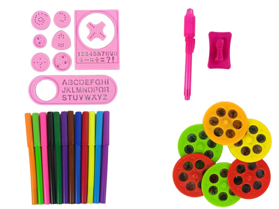 U kompletu se nalazi i mali tabure uz pomoć kojeg će vaše dijete moći udobno sjediti za stolom. I sjedalo i tabure ukrašeni su ružičastom bojom i bit će savršen dodatak uređenju dječje sobe. Na ploči stola nalaze se dvije male ladice u koje možete sakriti olovke u raznim bojama, uvijek su vam nadohvat ruke. Projektor u sredini stola izgleda kao prijateljska žirafa. Projektor u sredini stola nalikuje prijateljskoj žirafi i prikazuje različite slike životinja i likova koji se mogu nacrtati na komadu papira. Predlošci u setu naučit će vaše dijete kako pravilno nazivati geometrijske figure i pisati slova.