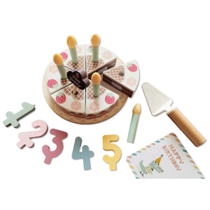 Drvena Prekrasna čokoladna rođendanska torta s jagodama i beze od Tooky Toya nije samo šarmantan dodatak dječjoj kuhinji, već i savršen ukrasni element na rođendanskoj proslavi. Sastoji se od 20 pažljivo izrađenih drvenih elemenata, svaki komad torte je međusobno povezan pomoću izdržljivog čička, čime se osigurava čvrsta struktura. Dodatno, set uključuje svjećice, brojeve od 1 do 5 , rođendansku čestitku i posebnu žlicu za kolače.