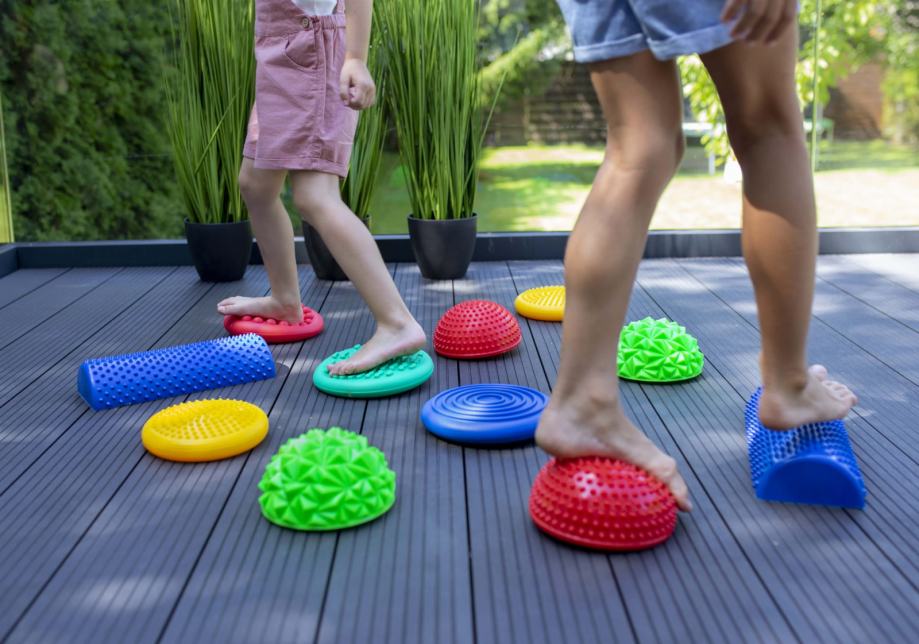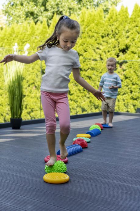 zahvaljujući hodanju po senzornoj stazi vaše dijete razvija ravnotežu, motoričku koordinaciju i prostorno planiranje. Istovremeno se uravnotežuje mišićna napetost djeteta, što može pozitivno utjecati na držanje tijela i otkloniti nedostatke stopala, poput valgus deformacije ili ravnog stopala.