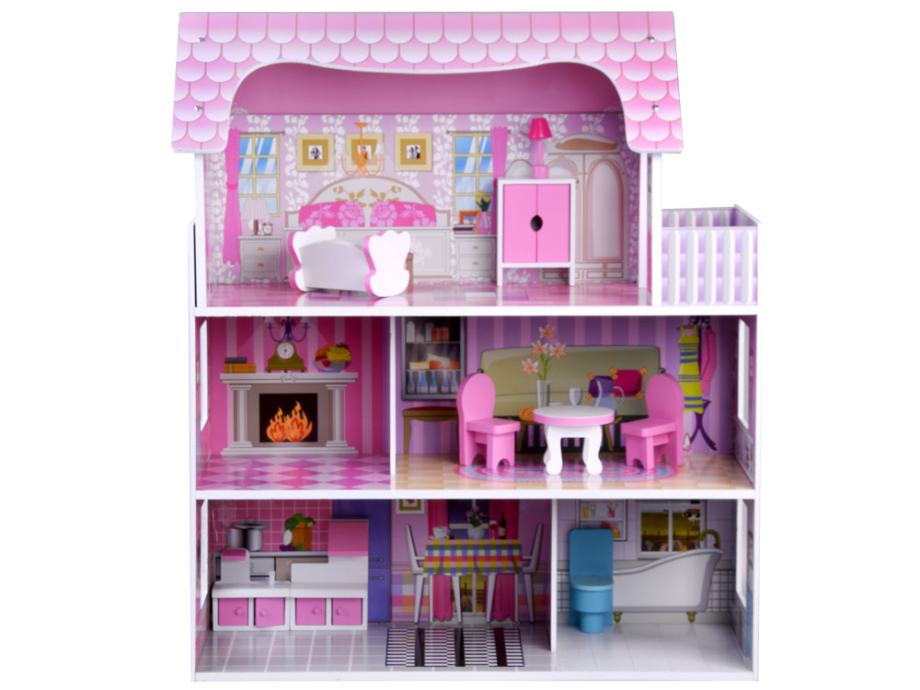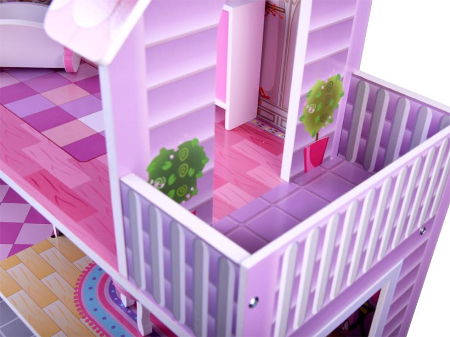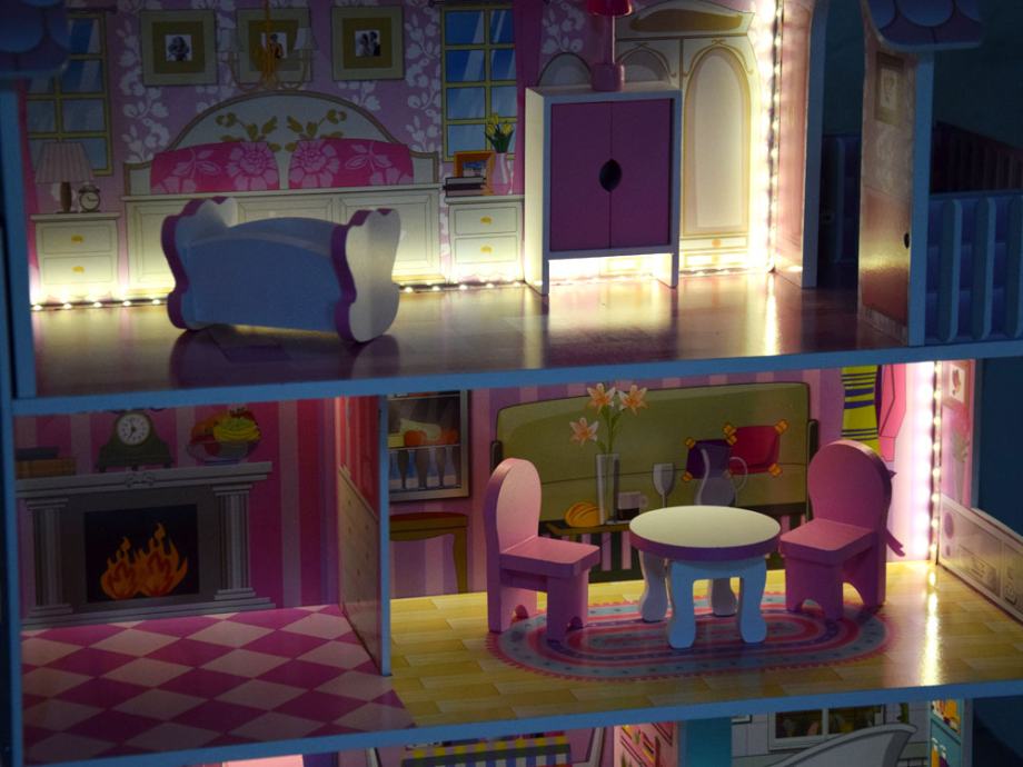 Elegantna kućica za lutke na tri kata, pet soba i terasa, ugostit će puno gostiju. Kuća je opremljena namještajem, LED rasvjeta raspoređena po svakoj etaži!