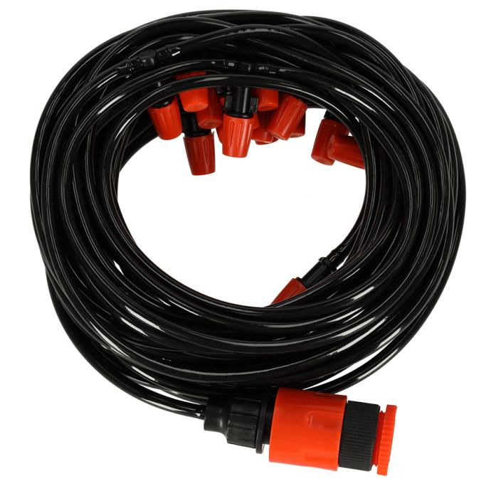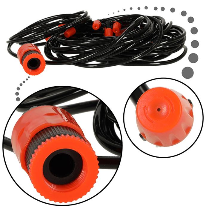 Cijeli sprinkler dugačak je 20 metara i ima 20 mlaznica raspoređenih u razmacima od jednog metra - tako da vodena magla ima stvarno dobar domet. Štoviše, crijevo se može izrezati na potrebnu duljinu ako je potrebno, što omogućuje promjenu udaljenosti između mlaznica.