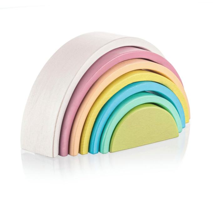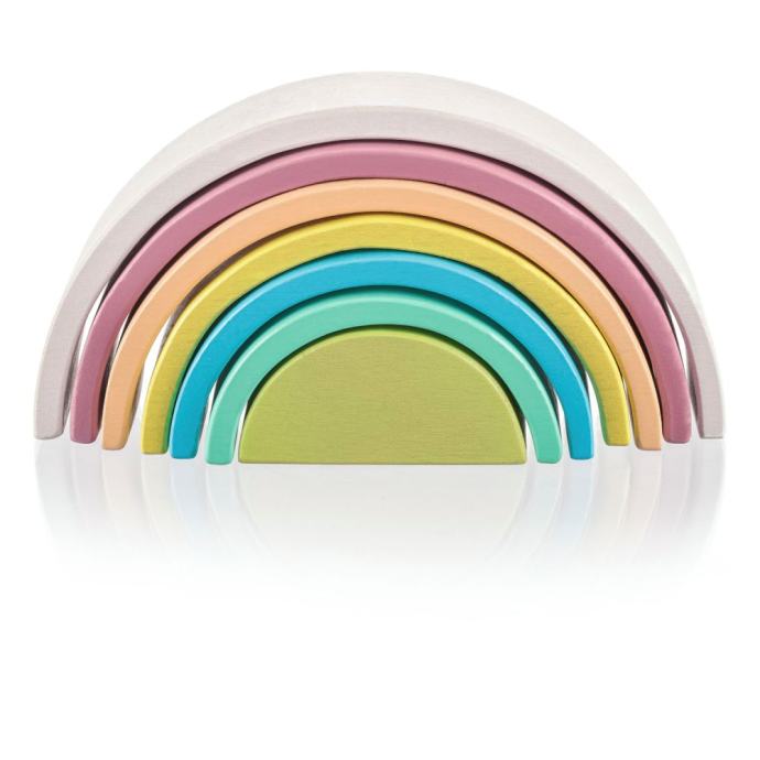 Slatka igračka u obliku i bojama duge izvrstan je pomagač u razvoju motorike, mašte i kreativnosti djece. Duga se može složiti u razne oblike. Set sadrži 7 jarkih, šarenih dijelova izrađenih od visokokvalitetnog bukovog drva.