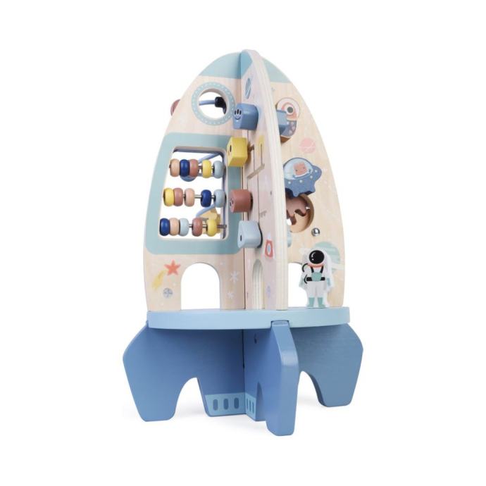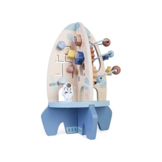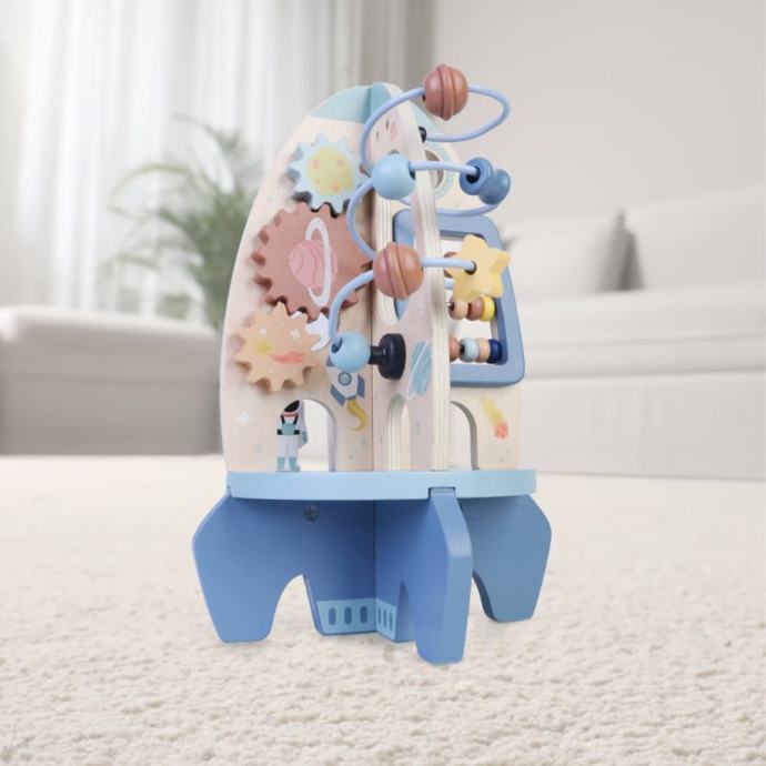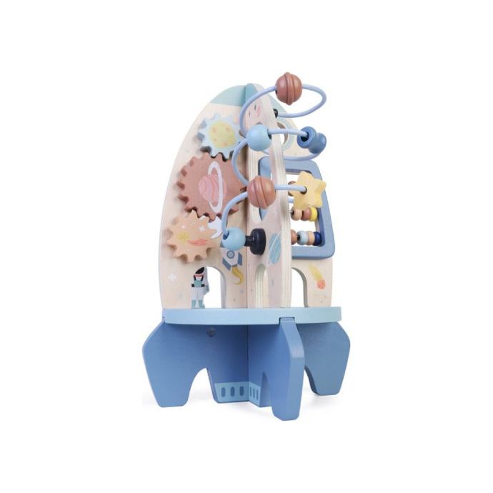 Drveni svemirski brod sadrži razne elemente za igru koji će zabaviti i poučiti vašu djecu. Mogu klizati perle u boji po cik-cak žici u labirintu, što razvija njihovu finu motoriku i koordinaciju oko-ruka. Zahvaljujući kliznim zupčanicima, djeca uče princip uzroka i posljedice. Mogu kliziti loptice po pultu kako bi vježbali orijentaciju u prostoru i naučili brojati.