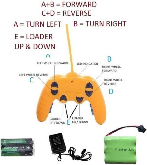 Pokreti bagera (naprijed, nazad, lijevo, desno, grablja gore / dolje, LED svjetlo)