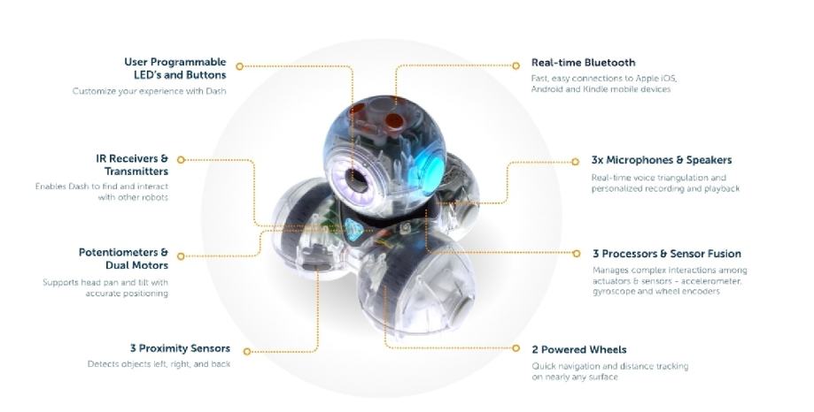 Dash robot je pravo malo čudo. Uz besplatne aplikacije kao što su Blockly ili Wonder, djeca od 6 do 11 godina mogu programirati Dasha da se kreće, pjeva, pleše, bljeska svjetlima, reagira na glasove, proizvodi zvukove, pa čak i priča priču. Dash ne sadrži kameru. Pomoću aplikacija djeca uče koncepte kodiranja kao što su sekvenciranje, događaji, petlje, algoritmi, operacije i varijable kroz samostalnu igru i vođene izazove. Djeca mogu gledati kako se njihovo virtualno kodiranje pretvara u opipljiva iskustva učenja u stvarnom vremenu dok Dash, sa svojim performansama i višestrukim senzorima, komunicira s okolinom i reagira na nju. Sada s uzbudljivim hardverskim nadogradnjama, Dash sadrži više radne memorije nego ikad prije i 18% dulje trajanje baterije.