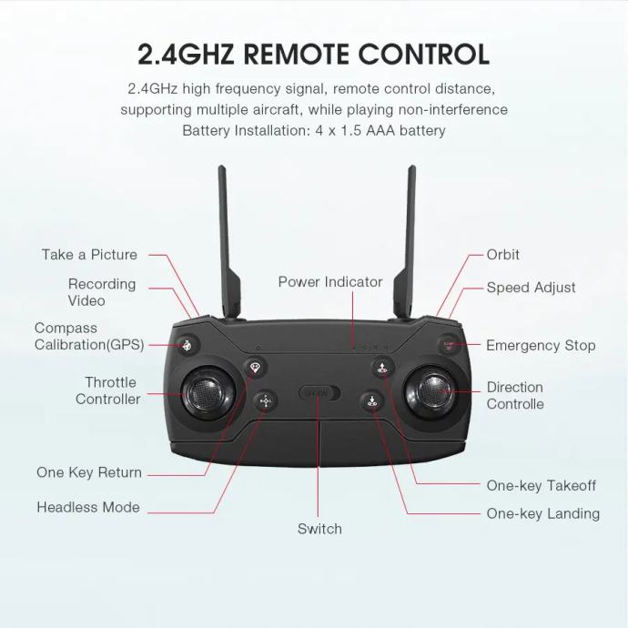 Funkcija: Gore/dolje, Naprijed/nazad, Skretanje lijevo/desno, Let u stranu, Brzina leta u 3 razine, LED svjetlo, GPSd pozicioniranje, Slijedi me, Okolni let, Let na putnoj točki, Način zadržavanja visine, Povratak jednom tipkom, Jedna tipka za polijetanje/slijetanje, WiFi FPV, kamera/video