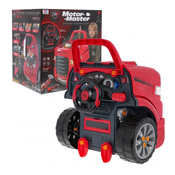 U setu: daljinski upravljač za svjetlosne i zvučne efekte, imitacija prednjeg dijela kamiona, upravljačka ploča s volanom i tipkama, pomični poklopac motora, dijelovi motora za sastavljanje i rastavljanje, prednji kotači koji se mogu odviti, vijci, odvijač i drugi alati za šarafljenje, automatski mjenjač s ručicom, sirena i mnoštvo drugih funkcija.