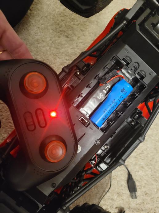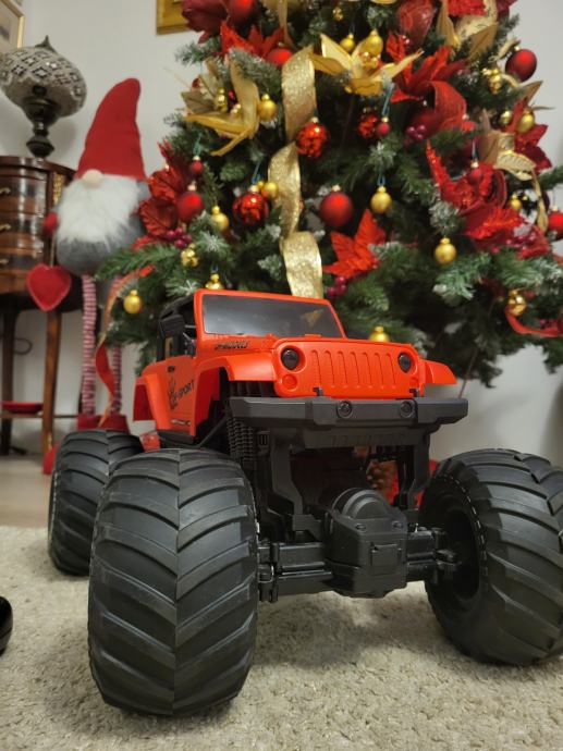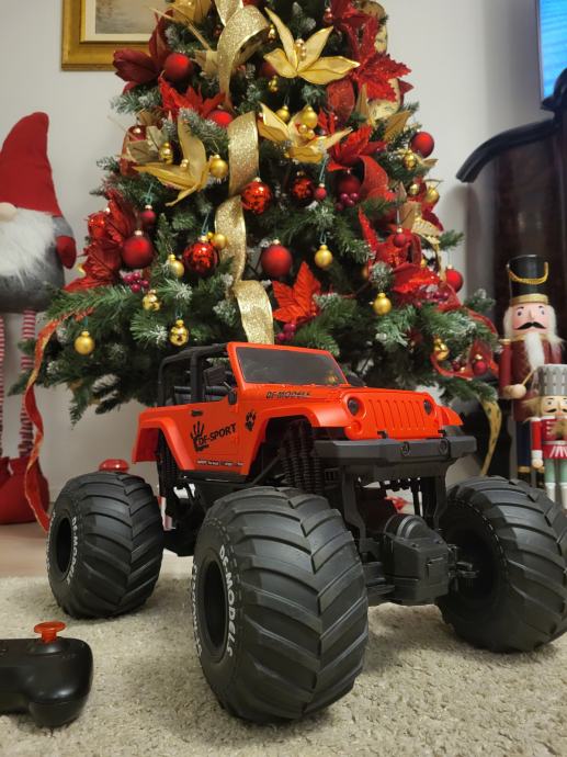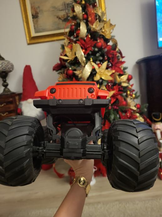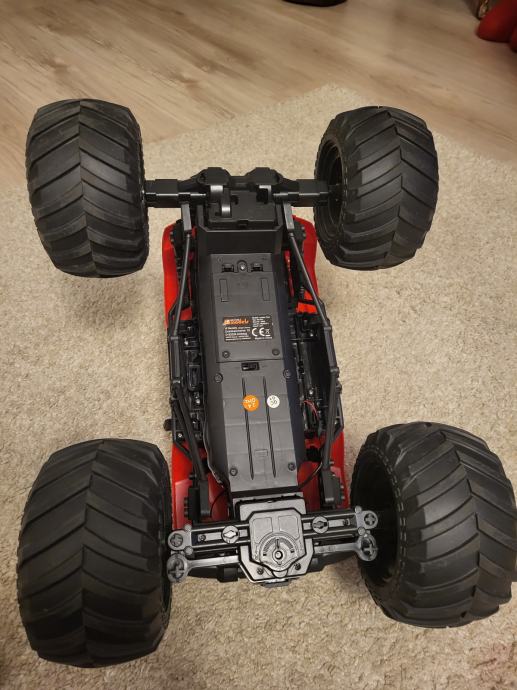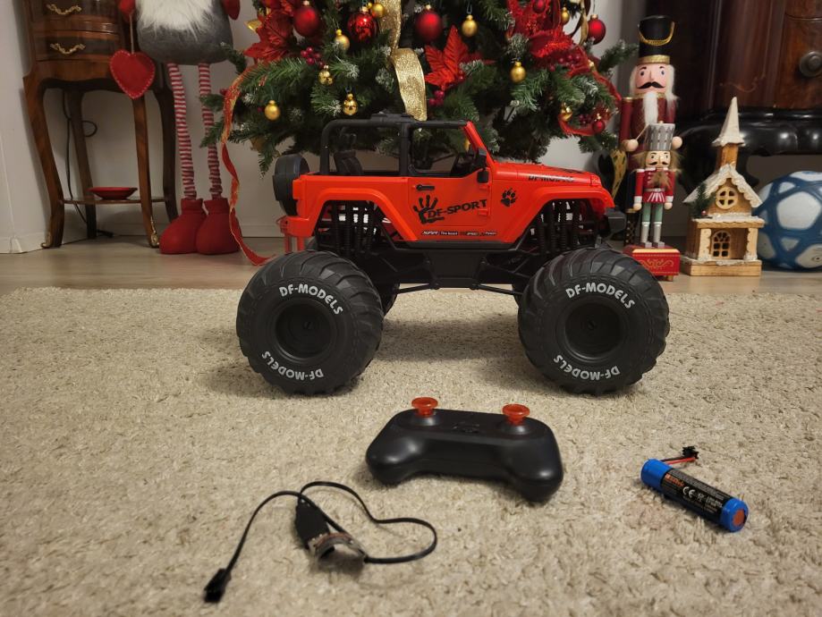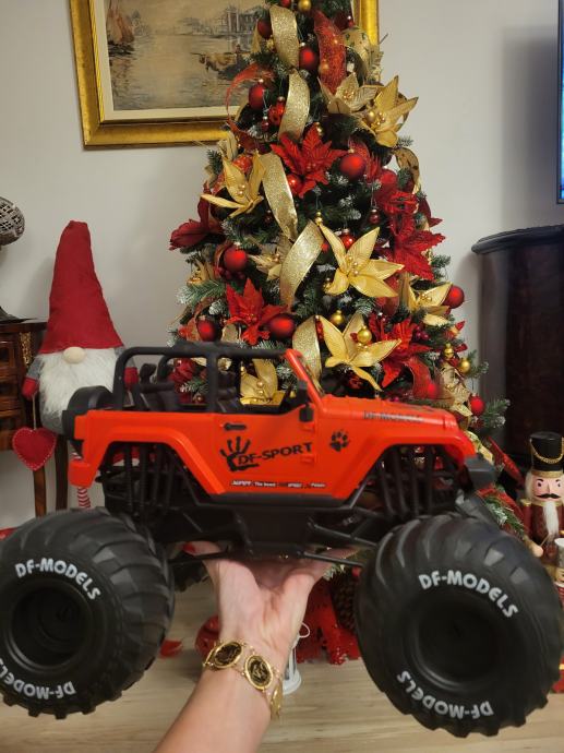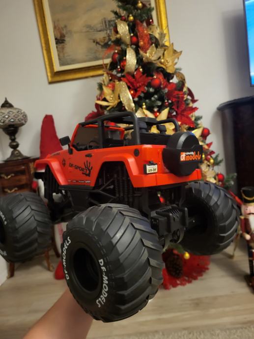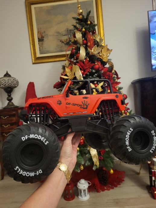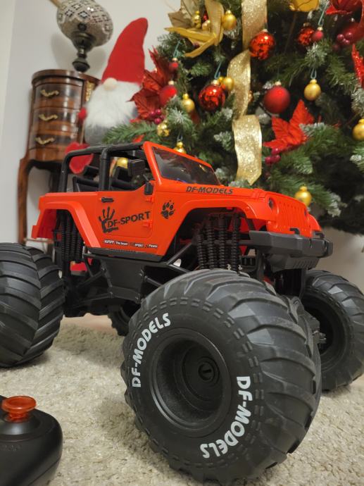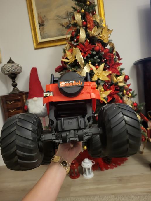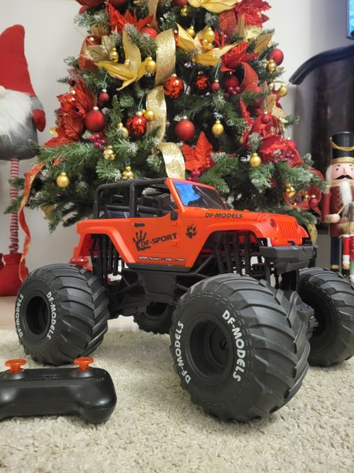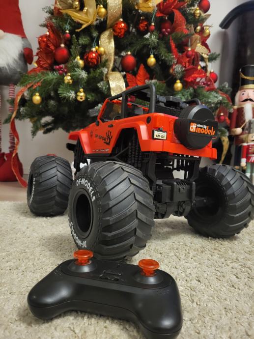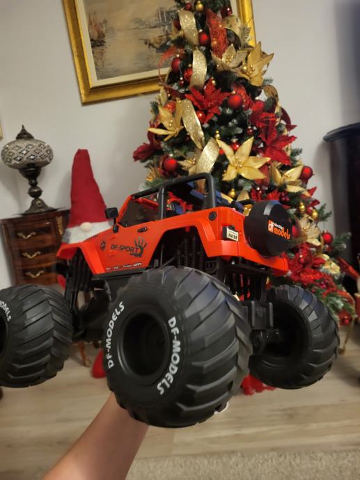 Monster truck na daljinski. Kupljen u Mulleru, plaćen oko 70€. Nemam kutiju. Jako malo korišten (2-3 puta), dijete ga je preraslo još kad je bio kupljen. Ima zvučne i svjetlosne efekte. Dugačak je 43cm, širok je 31cm, visok je 28cm. U daljinski idu dvije AA baterije, a u auto ide baterija koja se puni. Marka je iz Njemačke DF MODELS koja je specijalizirana za kvalitetne, ali pristupačne RC modele (vozila na daljinsko upravljanje autići, buggy vozila, terenskih kamioneta, crawlera, aviona i sličnih RC modela) za hobiste i početnike.