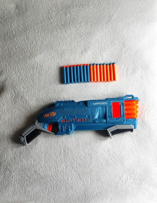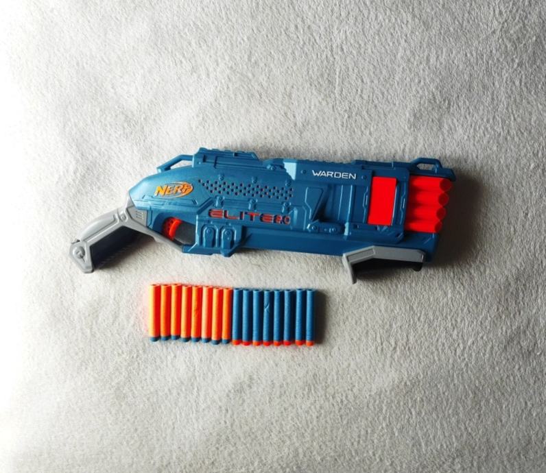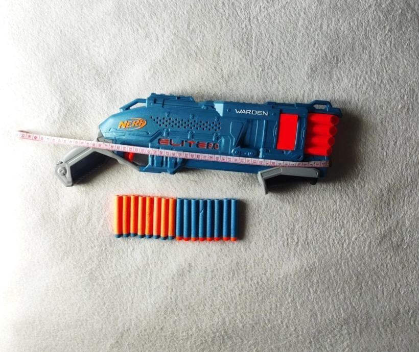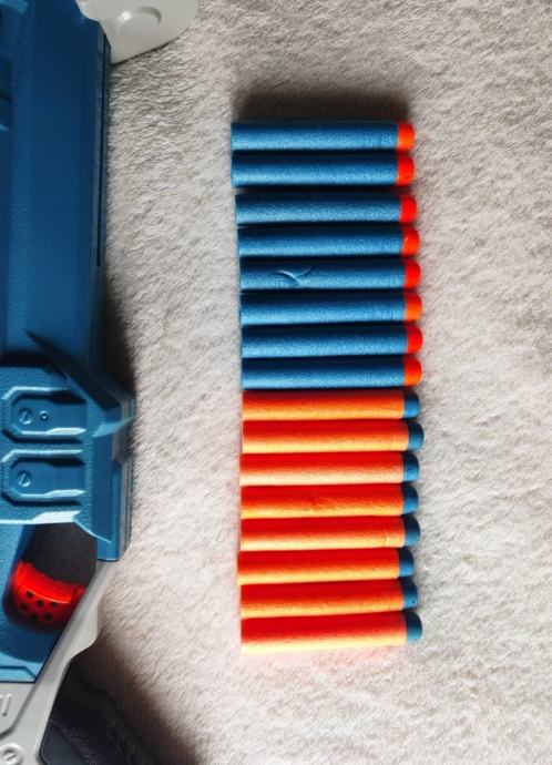 Blaster ima 8 plavih i 8 narančastih strelica, na kojima stoji oznaka Nerf