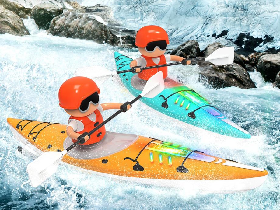 Realistična figura veslača pokreće vesla u ritmu kretanja kajaka, što ovu igračku čini još interaktivnijom i fascinantnijom. Plastična konstrukcija i vodootporni materijali jamče duge sate zabave kod kuće i na otvorenom.