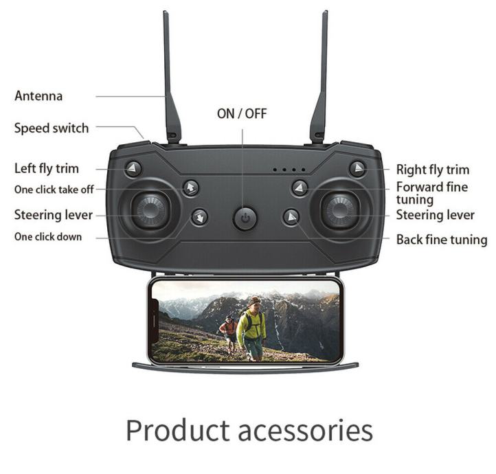 - Funkcije: gore / dolje, naprijed / nazad, lijevo / desno skretanje, bočni let, brzina leta u 3 koraka, LED svjetlo, način rada bez glave, automatski povratak jednom tipkom, način zadržavanja visine, WiFi FPV, putanja leta, kamera / video