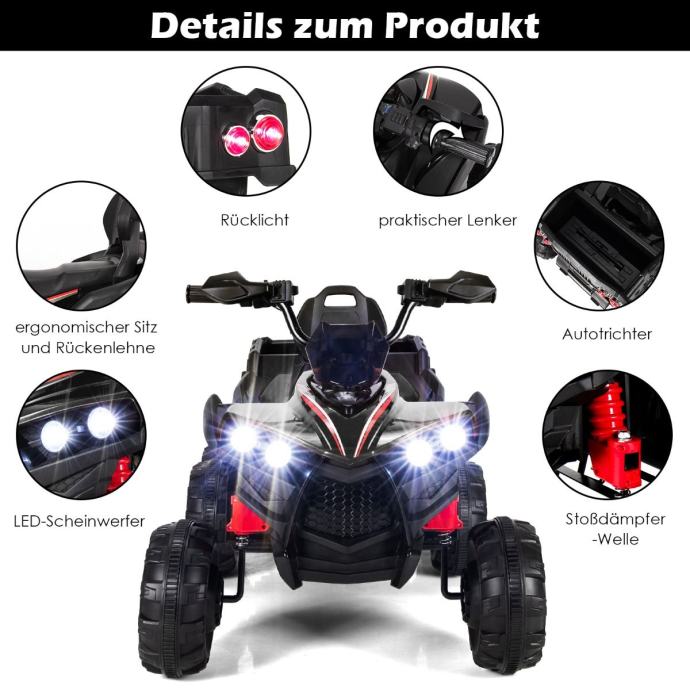 Akumulatorska baterija i vrijeme punjenja: Naše vozilo je opremljeno s punjivom baterijom (12 V, 10 Ah) i punjačem s UL certifikatom, koji vašoj djeci nakon punjenja može osigurati više od 40 minuta vremena za igru. Vrijeme punjenja našeg dječjeg četverotočkaša je 8-12 sati.