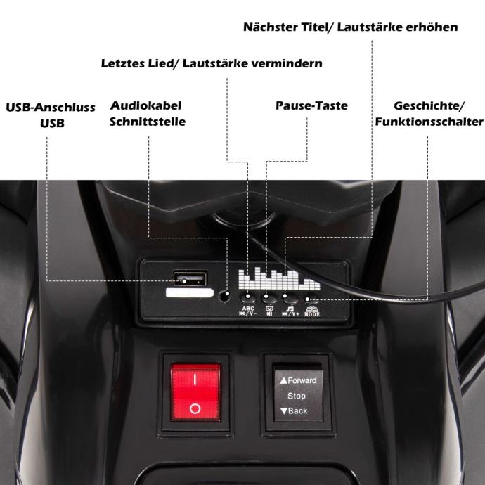 Dizajn prijateljski prema djeci: Njegov cool izgled, LED svjetla, glazba i priče pružaju dodatnu zabavu za djecu. Terensko vozilo omogućuje djeci pohranjivanje igračaka i grickalica. Praktično, široko sjedalo i ergonomska naslonjača mogu djeci starijoj od 3 godine osigurati udobnu i sigurnu vožnju