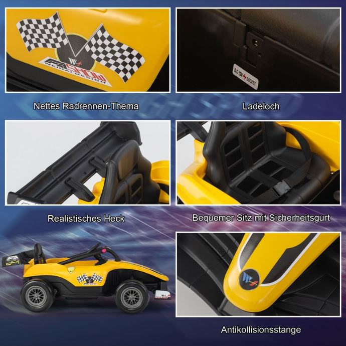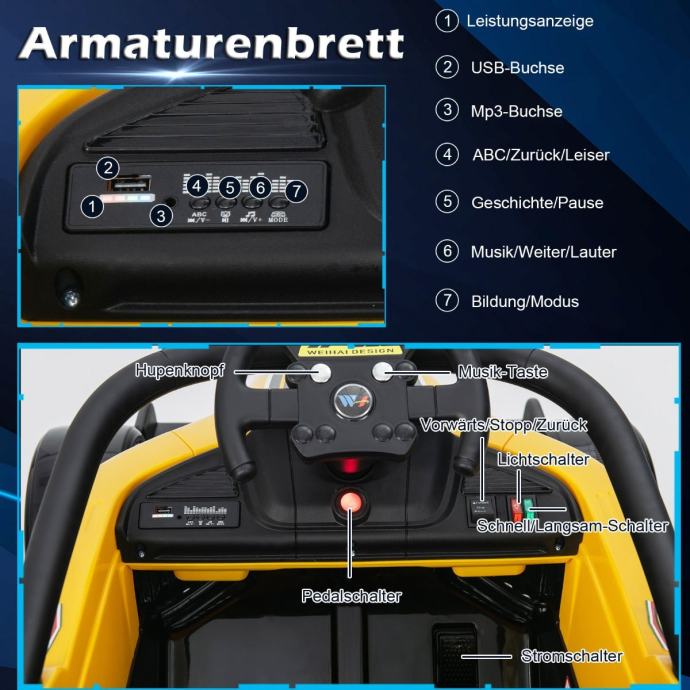 Dječji pogon i daljinski upravljač: vaša djeca mogu upravljati vožnjom automobilom jednostavno pritiskom na pedalu za ubrzanje i mogu iskusiti vožnju na visokoj i nižoj brzini. I za one djecu koja su premlada da bi razumjela pravila vožnje, njihovi roditelji mogu umjesto toga upravljati autom na daljinu. U stanju daljinskog upravljanja dostupne su 3 opcije brzine.
