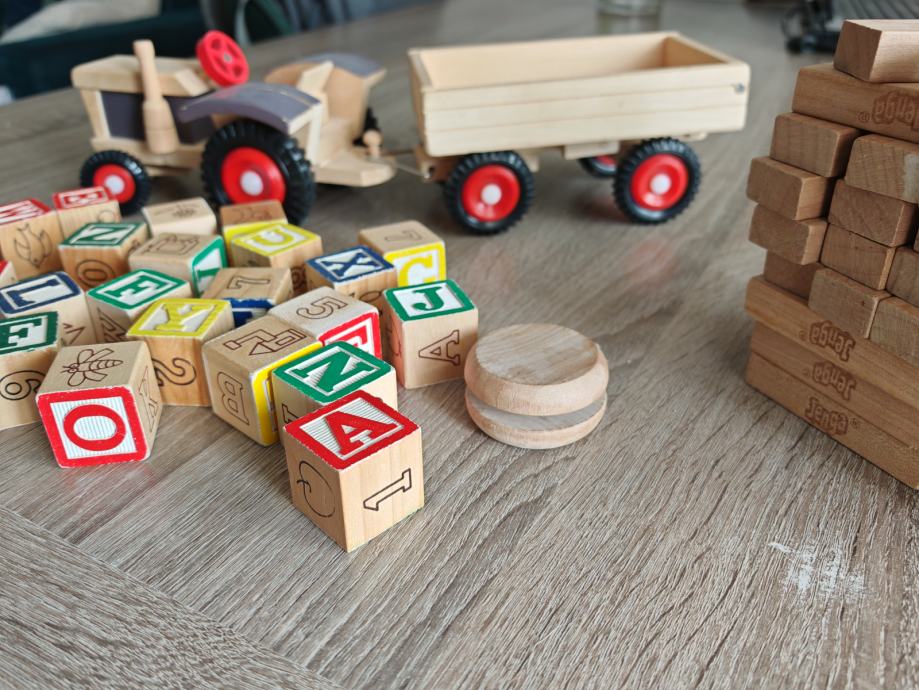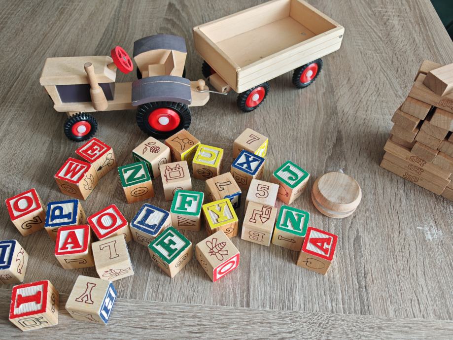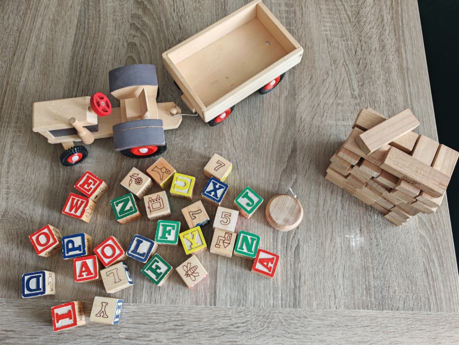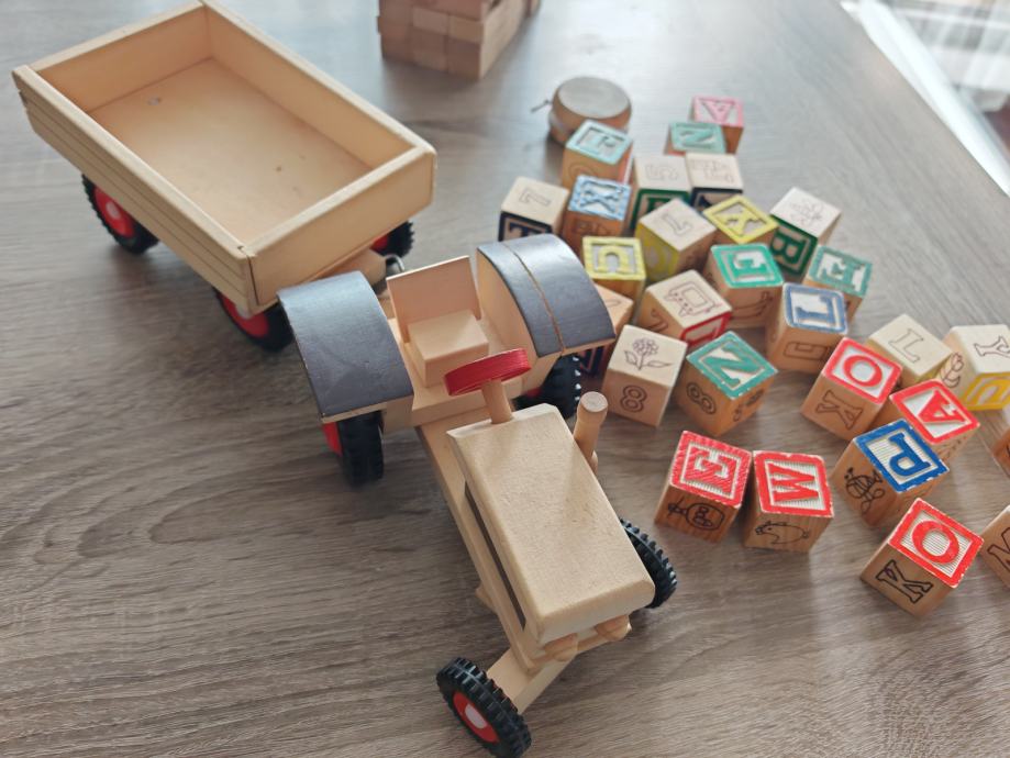 Bino drveni traktor s prikolicom i kockama s brojevima i slovima.