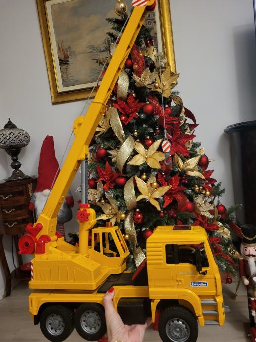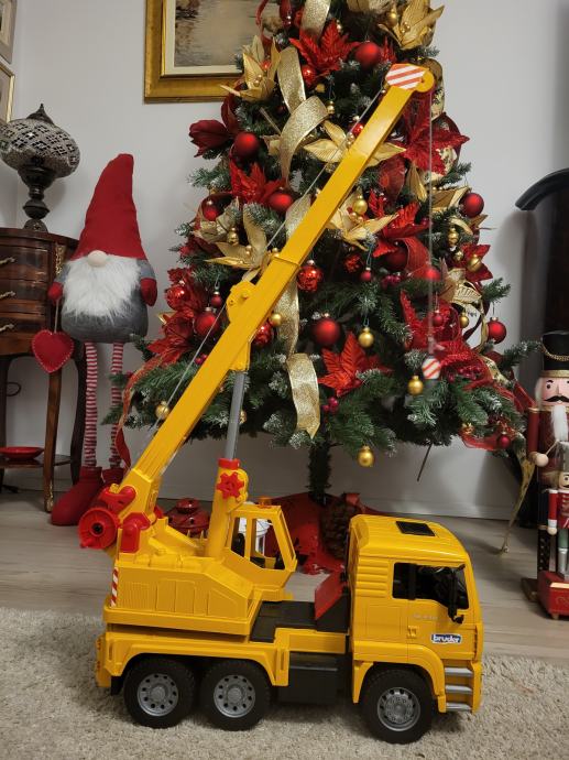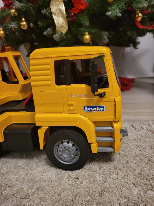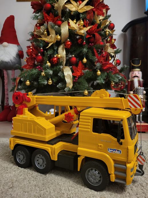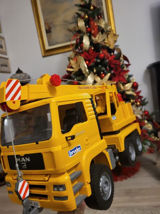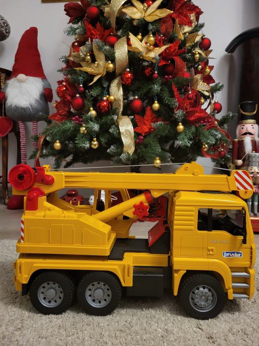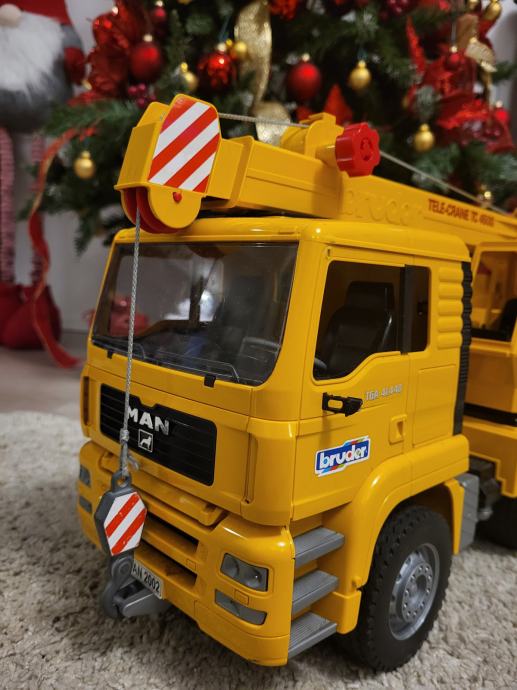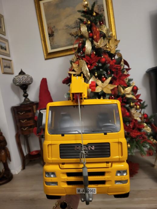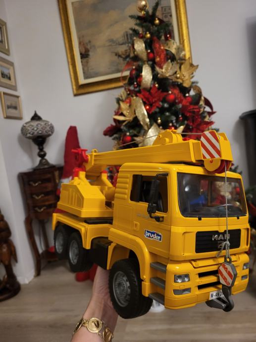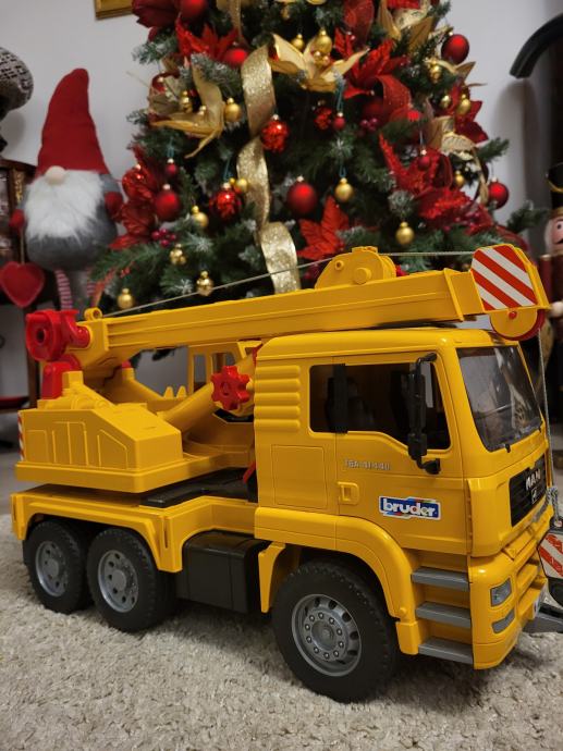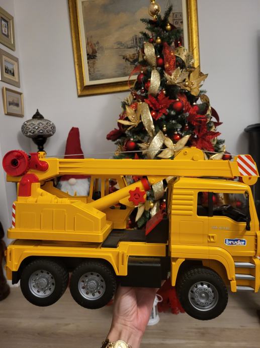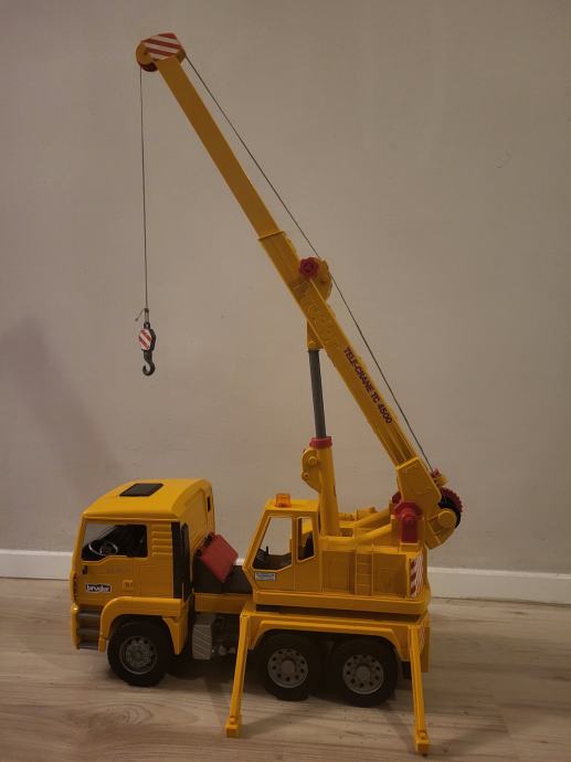 Bruder kran. Dizalica se produžuje u visinu i može se okretati lijevo-desno. kuka je metalna, kotači su gumeni. Ima nagibnu kabinu i četiri potporne noge koje se mogu skinuti i staviti na stražnji dio kamiona.