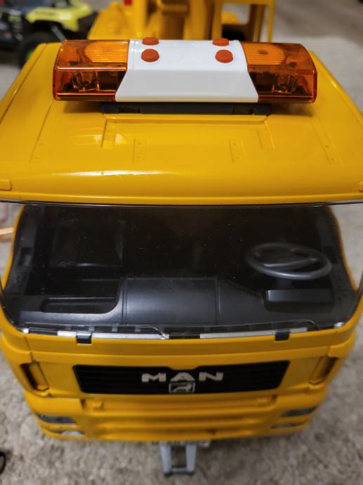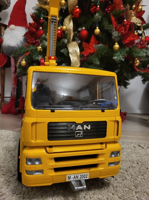 Priključak dizalice se može okretati za 360°, a ruka dizalice s kukom se može produžiti zakretnim kotačem i hidraulikom podešavati visinu. Vitlo za sajle je potpuno funkcionalno uz pomoć poluge. Gumb za otpuštanje ubrzava spuštanje tereta. Četiri nosača pružaju siguran oslonac. Sliku upotpunjuju gume s gaznim slojem i priložena kutija za alat. Za još veću zabavu tijekom igranja, MAN kamion dizalicu možete opremiti svjetlosnim i zvučnim modulom br. proizvoda: 02801 (nije uključeno).