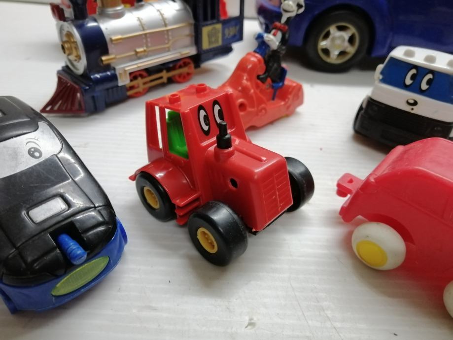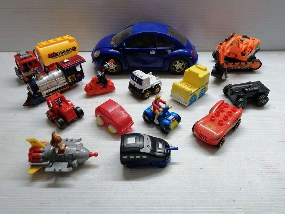 Lot dječijih igračaka, bager / utovarivač veličine 18cm (novo, nekorišteno), kamion cisterna veličine 16cm (novo, nekorišteno), Volkswagen buba / beetle maketa veličine 27cm (korištena, nedostaje jedan točak), lokomotiva na baterije veličine 16cm (korištena) i druge igračke.