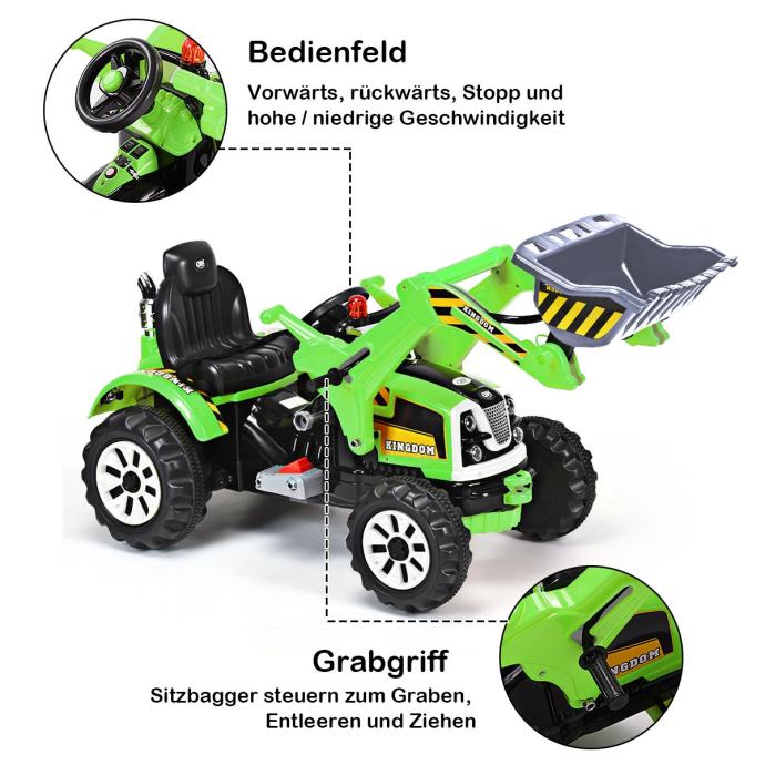 Velika zabava u vožnji: bager može voziti brzinom od 2,5 do 5 km/h, kako naprijed tako i unatrag. To djeci pruža mnogo mogućnosti za višesatnu igru. Djeca mogu upravljati smjerom s volanom i pedalom.
