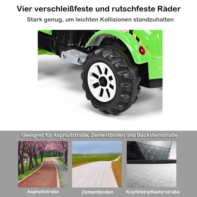 Pouzdan dizajn: s 4 debela i otporna na habanje PE kotača, bager može voziti po bilo kojoj površini. Sigurnosni pojas i veliko sjedalo osiguravaju sigurnost i udobnost.