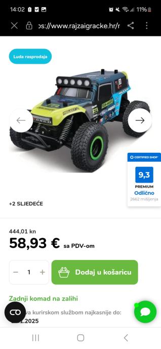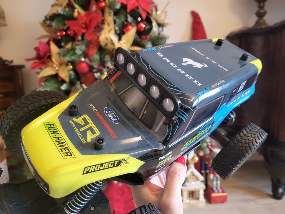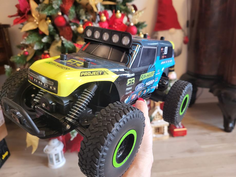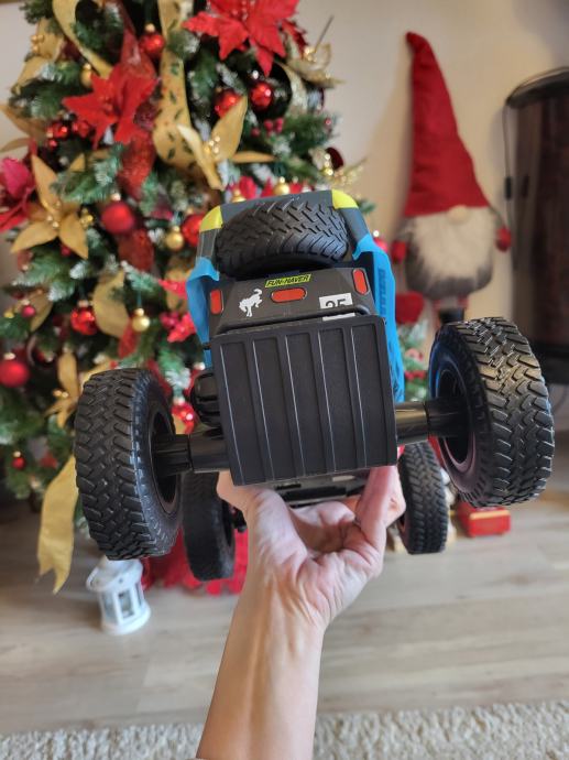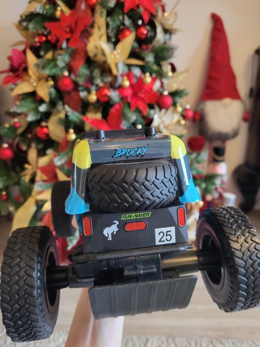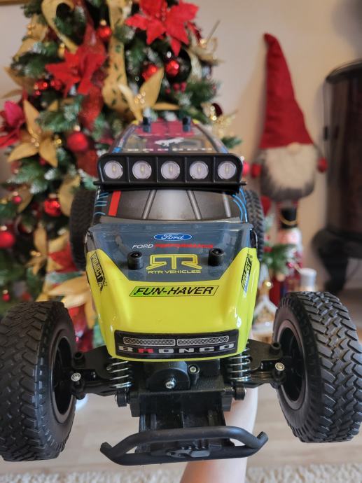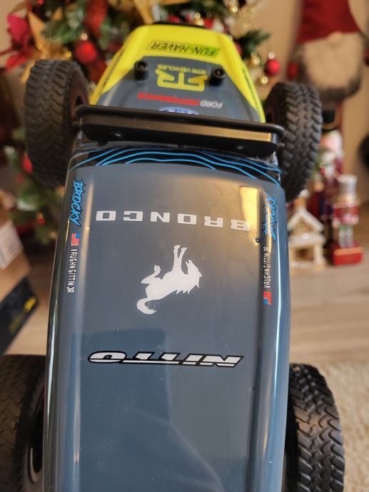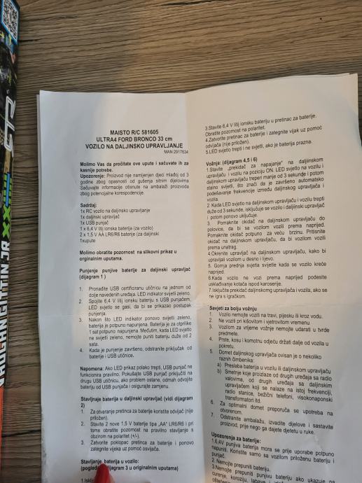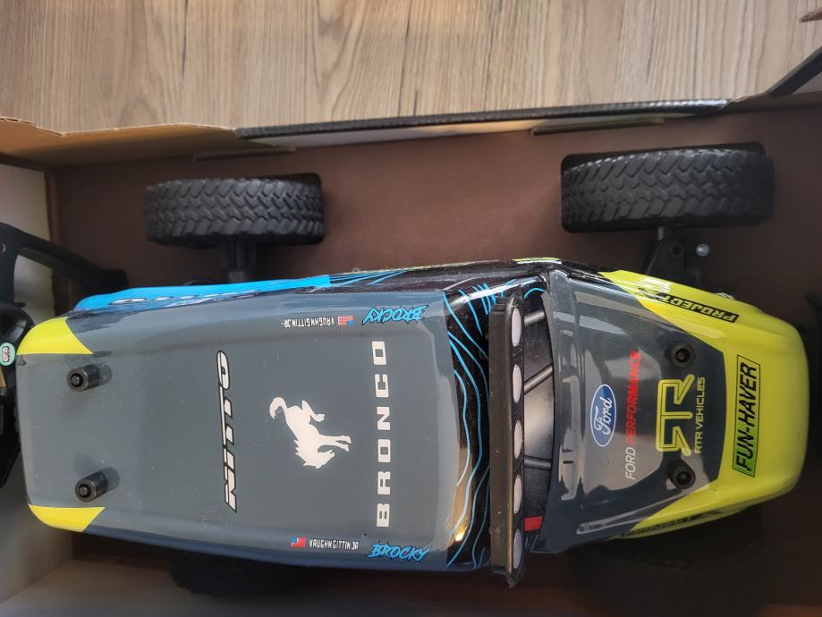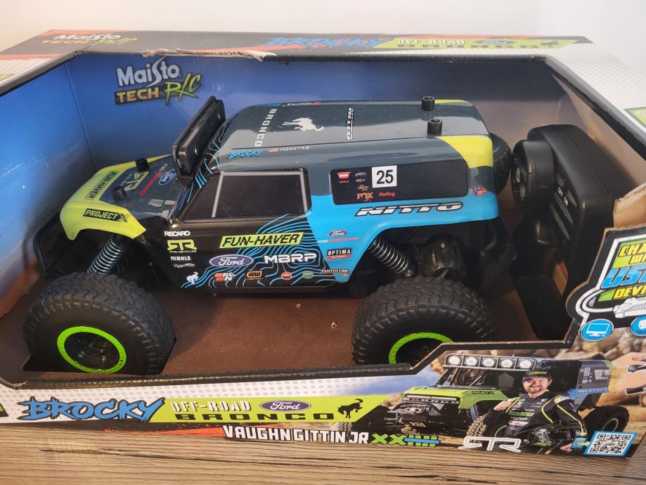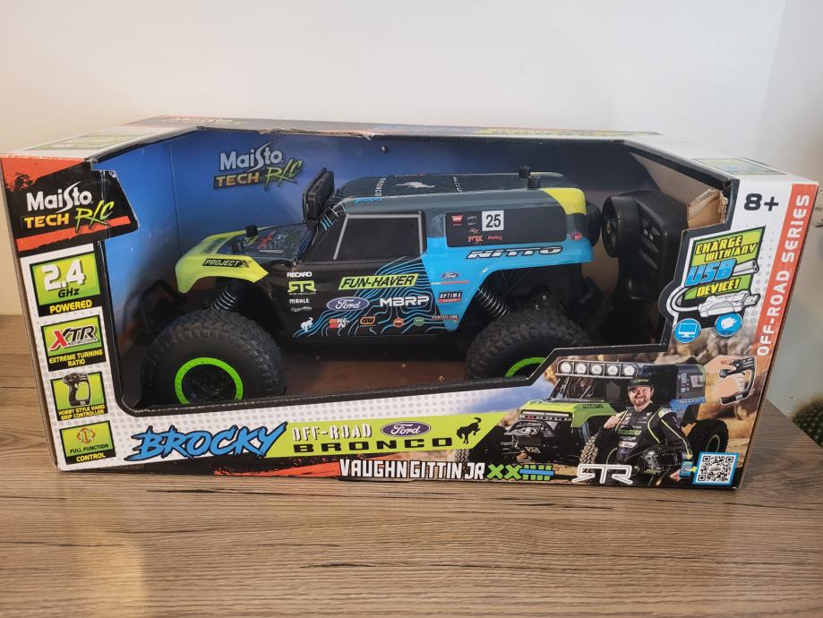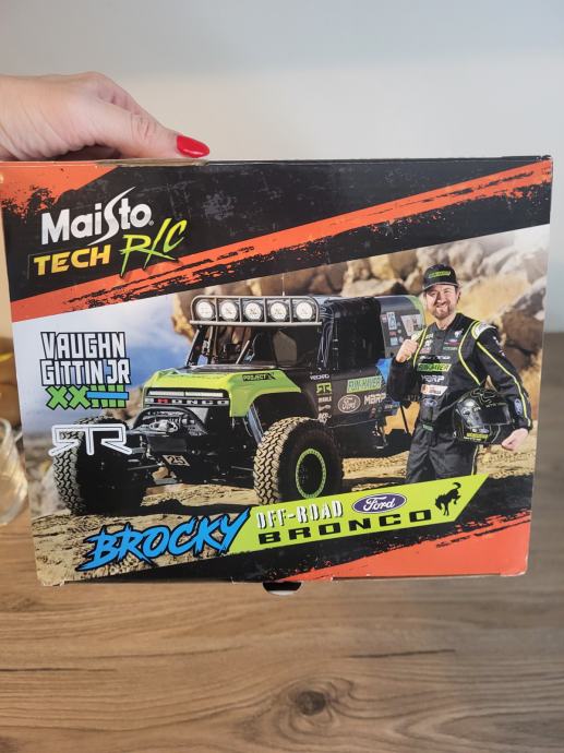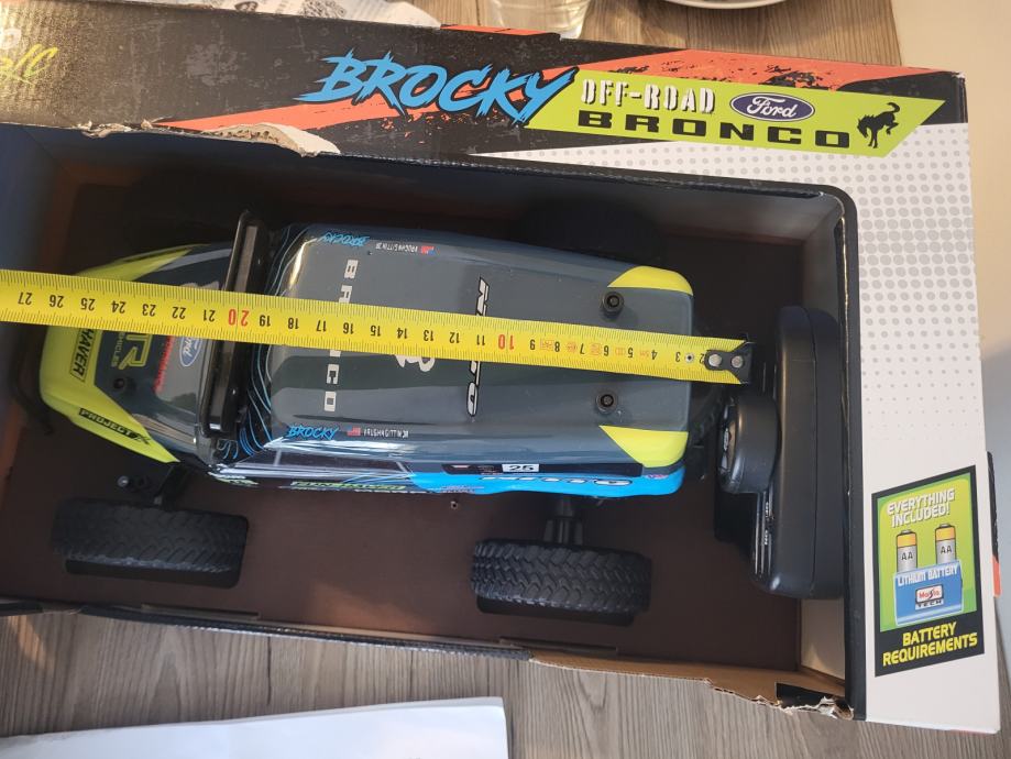Kupljen u Mulleru, Bronco autić na daljinski. Većih dimenzija, dolazi s kutijom. Autić je vožen par puta, vraćen u kutiju. Autić je kao nov, ali ne radi baterija (krene pa stane). To se dogodilo nedugo nakon kupovine, nismo imali račun da ga vratimo u Muller tako da ga prodajemo kao neispravnog.