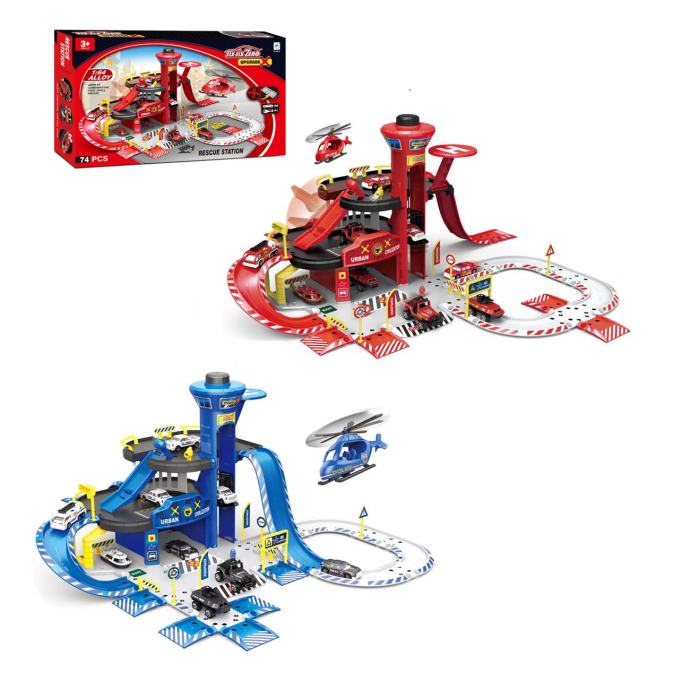 Uživajte u zabavi na tri razine! Setovi puni funkcija i dodataka. Ove garaže predstavljaju svijet hitnih službi s helikopterom i vozilima za spašavanje. Set za igru od 74 dijelova ima toranj s ručnim podizanjem, garažu i heliodrom. Ručno upravljane lansirne rampe i tobogani osiguravaju brzo putovanje do mjesta nesreće. Dizajnirane s realističnim značajkama prema pravim vatrogasnim i policijskim vozilima. Zabavan set koji zahtjeva prvo kreativno slaganje seta, potom razmještaj vozila i znakova a zatim igra može započeti. Vozila su izrađena od metalne legure. Opremljeni su s radnim kotačima s kliznom funkcijom.