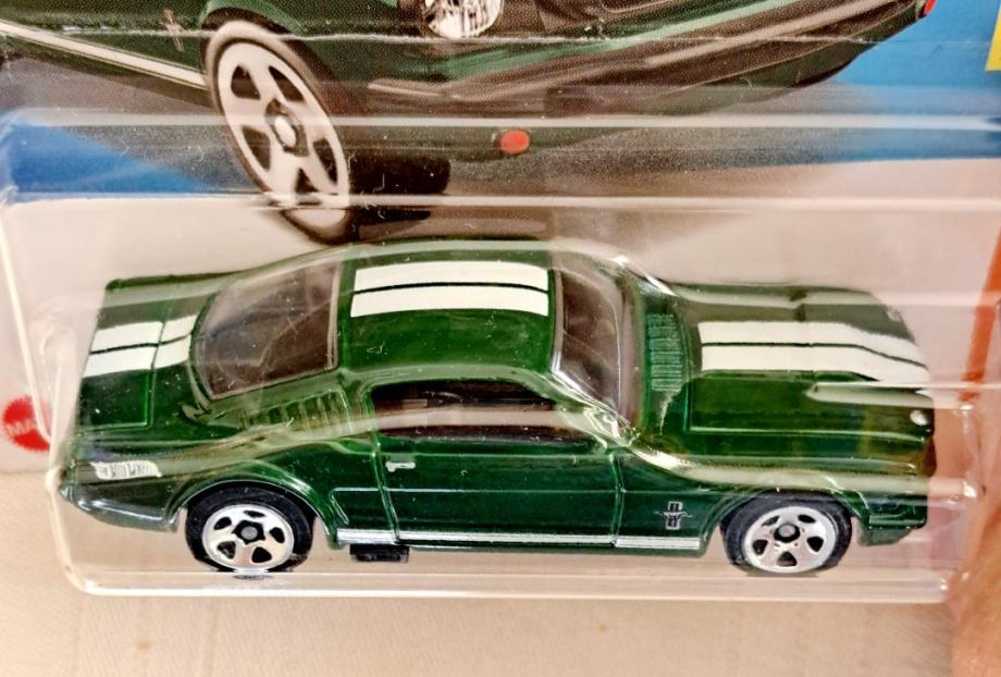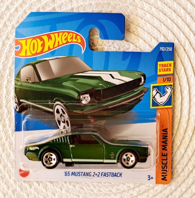'65 MUSTANG 2+2 FASTBACK je proizvod Ford Motor Company a predstavljen je u proljeće 1964. Pojavom Mustanga stvorena je nova klasa automobila koja će biti poznata kao poni automobil. Dugi poklopac motora i kratak krov pokazao se stilskim pogodkom pa je inspirirao i konkurenciju.Proizvodio se u tri verzije, coupe, kabrio i fastback. Najpopularnija verzija je bio fastback. Prva generacija Mustanga prodana je u 77.079 primjeraka a proizvodnja je prekinuta 1973. HW dizajner Alec Tam je autor odlijevka Mustanga za godinu 2008. kad je bio New Model. Proizvodi se do danas uz prekide 2017. 2023. i 2024. Na listi za 2025. nalaze se dvije opcije koje se razlikuju samo u podnici. Jedan ima sivu plastiku a drugi ima podnicu od ZAMACa (legura cinka, aluminija, magnezija i bakra, neobojena). Model sa slike primjerak je iz 2022. a uz njega u ponudi su još dvije inačice: tamno smeđa i Target Exclusive (bazni model različito označen crvenom bojom) iz serije Red Edition. Proizvedeno u Malaysiji