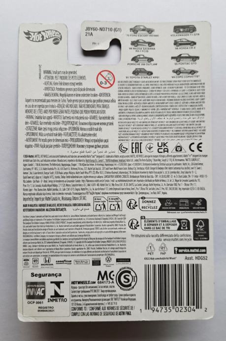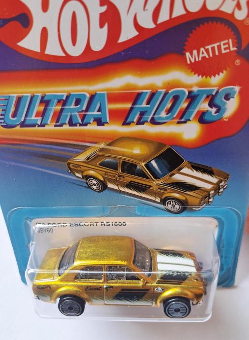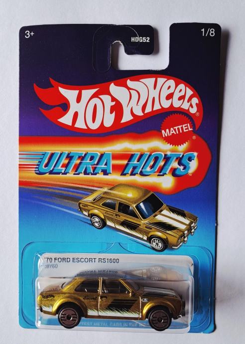 FORD ESCORT RS 1600 Fordov je marketing predstavio Escorta riječima 'Moćna mješavina'. Sa novim Coswortovim motorom (preinaka motora iz formule 2) koji proizvodi 115 ks, razvija brzinu od 240 km/h i do 'stotke' mu treba 8,5 sec su prilično dobre performanse za skromnu obiteljsku limuzinu početkom '70ih. Nakon homologacije počinje sportski život ovog izuzetnog automobila. Dominira na utrkama i na Relly utrkama. Tijekom desetljeća mijenjaju se performase na modelima oznake RS. Novi šampioni sad nose oznake MK1 i MK2. Za HW, odljevak je dizajnirao Fraser Campbell a model kao 'New Model' je na popisu za 2015. u dvije opcije. Slika prikazuje model iz 2025. godine i nalazi se u seriji 'Ultra Hots' (1/8). Na poleđini produženog kartona istaknuto je svih 8 modela iz serije. Cijela serija je u Spectraflame bojama. .