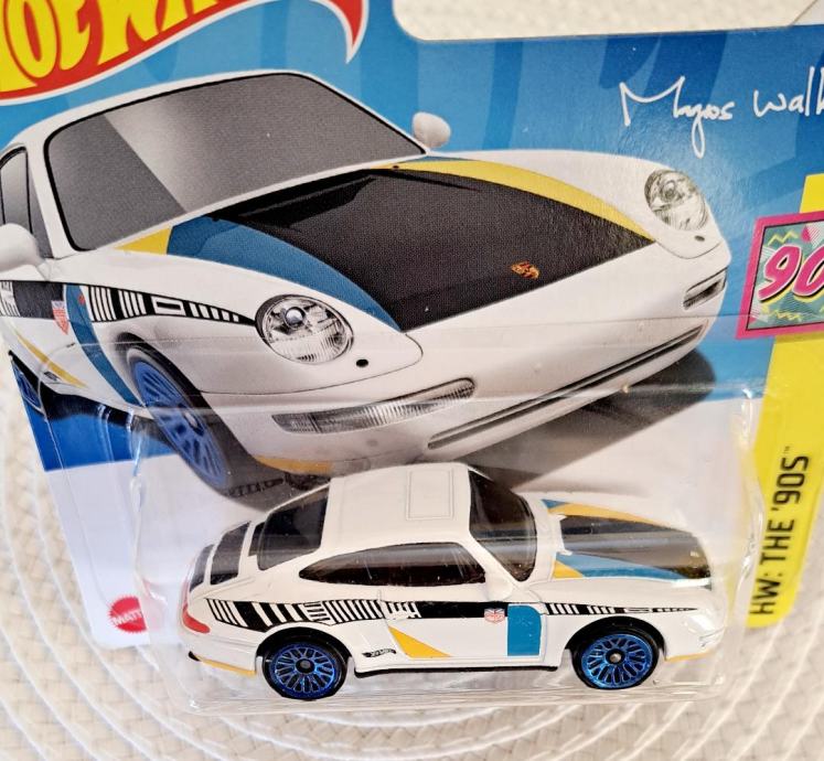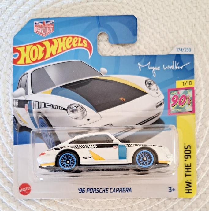 '96 PORSCHE Carrera je četvrta generacija modela 911 koji se proizvodio od 1994. do 1998. Danas je ta serija jedna od najtraženijih i najskupljih automobila među svjetski poznatim kolekcionarima .Jedan od njih je Magnus Walter, Britanac, graditelj automobila po narudžbi, modni dizajner i kolekcionar Porschea. Napustio je Britaniju i osnovao tvrtku u USA. Ljubav prema Porscheu rezultirala je skupljanjem i obnovom 911-ica. Postao je poznat kao Urban Outlaw (Urbani Odmetnik). Osnovao je i robnu marku Serius Clothing Brand, popularnu među glumcima. Snimljen je dokumentarni film o njegovom životu. HW dizajner Ryu Asada je autor odlijevka. Kao New Model debitirao je u kolekciji za 2019. pod brojem 155/250 i u seriji 'Nightburnerz' 4/10. U ponudi su bila tri modela, dva bijela i jedan svijetlpolavi. Slika prikazuje Model iz 2024. Ukrašen je crnim,plavim i žutim površinama te crno-bijelim trakama. Tu su i naljepnice 'Carrera' , 'Hot Wheels' i oznaka Magnus Walker. Osim ovog modela bio je u ponudi i plavi. Oba su modela pod brojem 174/250, u seriji HW: The '9os su pod brojem 1/10. Proizvod je iz Malaysija
