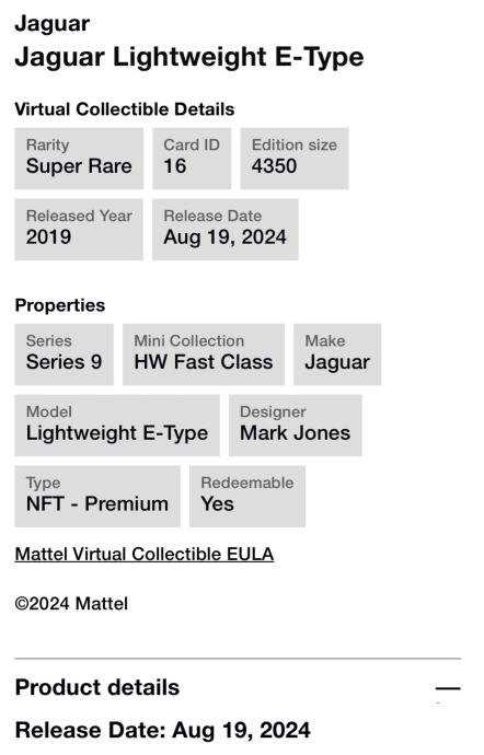 Prodajem višak iz kolekcije Hot Wheels NFT Jaguar Lightweight E-Type, tvornički zapakiran - idealan za kolekcionare, samo 4350 komada.