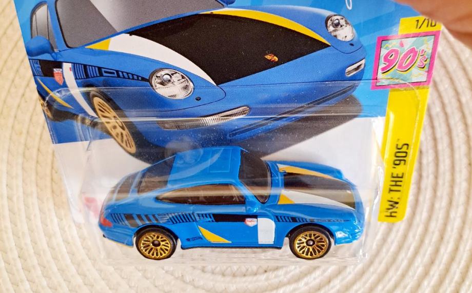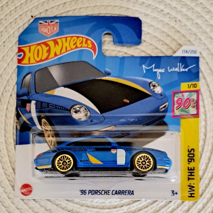 '96 PORSCHE Carrera je posljednja peta generacija modela 911 koji se proizvodio od 1994. do 1998. Danas je ta serija jedna od najtraženijih i najskupljih automobila među svjetski poznatim kolekcionarima .Jedan od njih je Magnus Walter, Britanac, graditelj automobila po narudžbi, modni dizajner i kolekcionar Porschea. Napustio je Britaniju i osnovao tvrtku u USA. Ljubav prema Porscheu rezultirala je skupljanjem i obnovom 911-ica. Postao je poznat kao Urban Outlaw (Urbani Odmetnik). Osnovao je i robnu marku Serius Clothing Brand, popularnu među glumcima. Snimljen je dokumentarni film o njegovom životu. HW dizajner Ryu Asada je autor odlijevka. Kao New Model debitirao je u kolekciji za 2019. pod brojem 155/250 i u seriji 'Nightburnerz' 4/10. U ponudi su bila tri modela, dva bijela i jedan svijetlpolavi. Slika prikazuje Model iz 2024. Ukrašen je crnim,plavim i žutim površinama te crno-bijelim trakama. Tu su i naljepnice 'Carrera' , 'Hot Wheels' i logo' Magnus Walker. Osim ovog modela bila je u ponudi i bijelia varijanta.