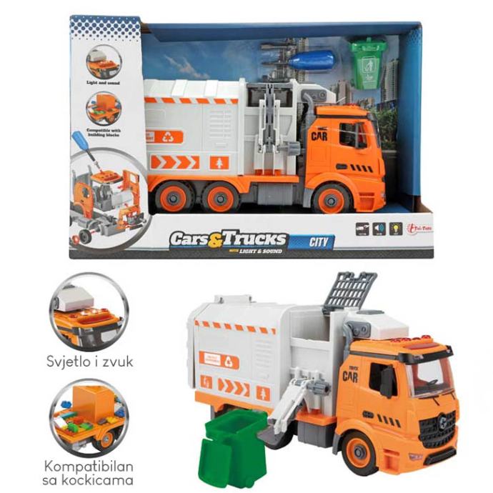 Kamion emitira svjetlost, pa čak i zvukove! Kamion za smeće možete rastaviti odvijačem jer su u samom kamionu skrivene cigle!
