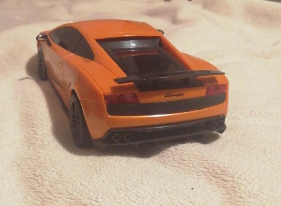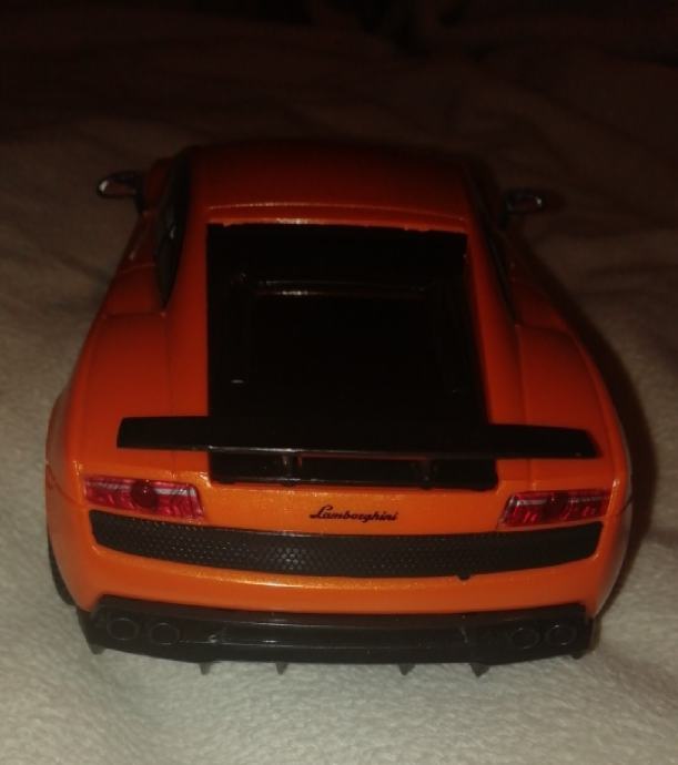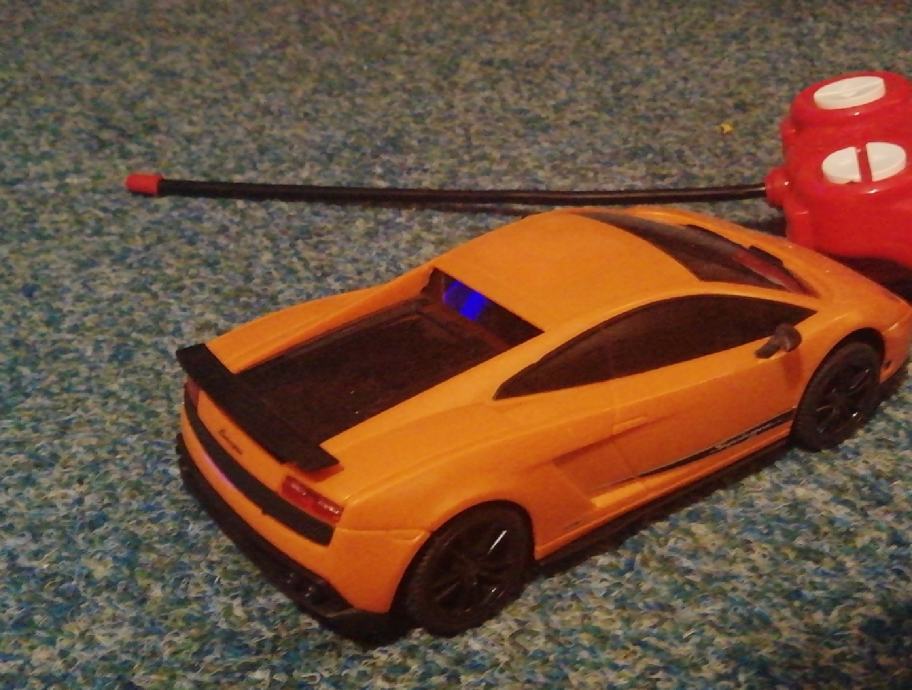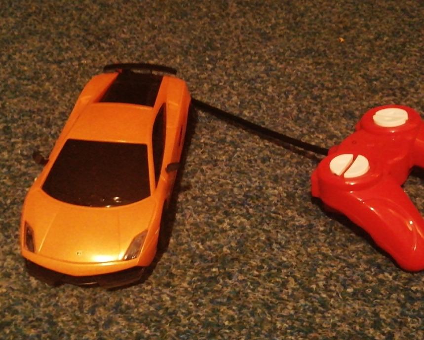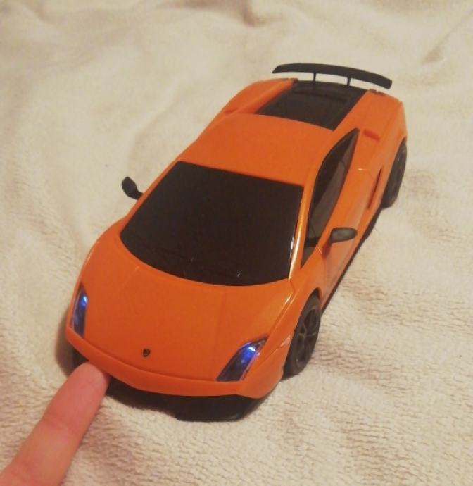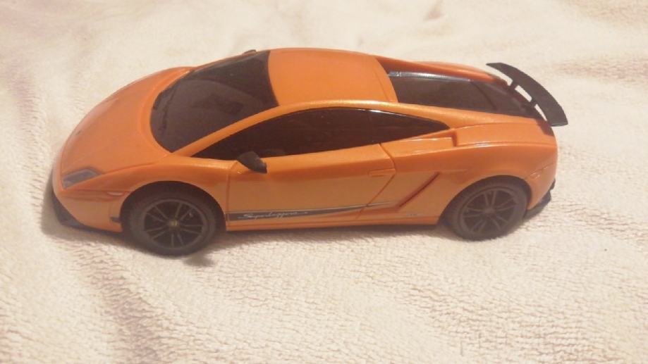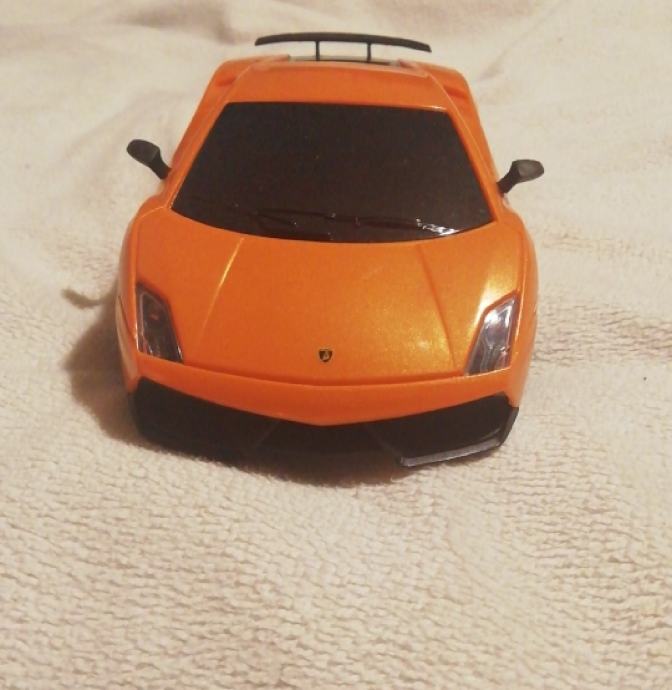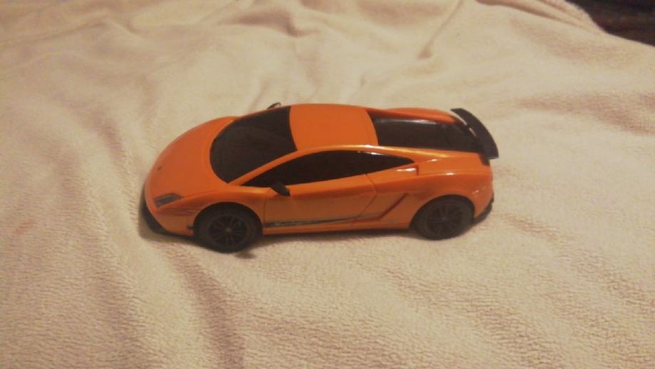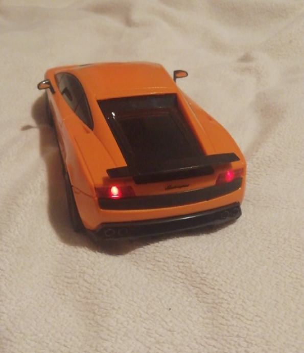 Samo isproban da li radi. Obzirom na mali prostor, nema se di voziti.. Kutiju smo bacili. Svjetla svjetle kad se vozi.Ide naprijed , nazad i lijevo, desno. Baterije su i u auticu i daljinskom. Dimenzije 18x8cm,boja perla narancasta sa crnim. Lamborghini superleggera Nedostatak je da se vide po crnim dijelovima I na krovu crte, kao da je ogreben. Takav je dobiven!